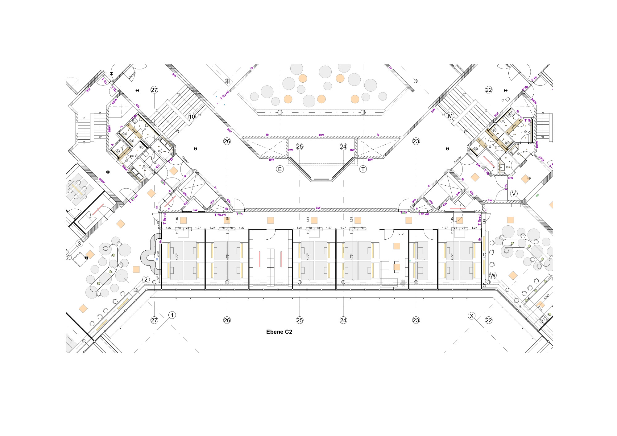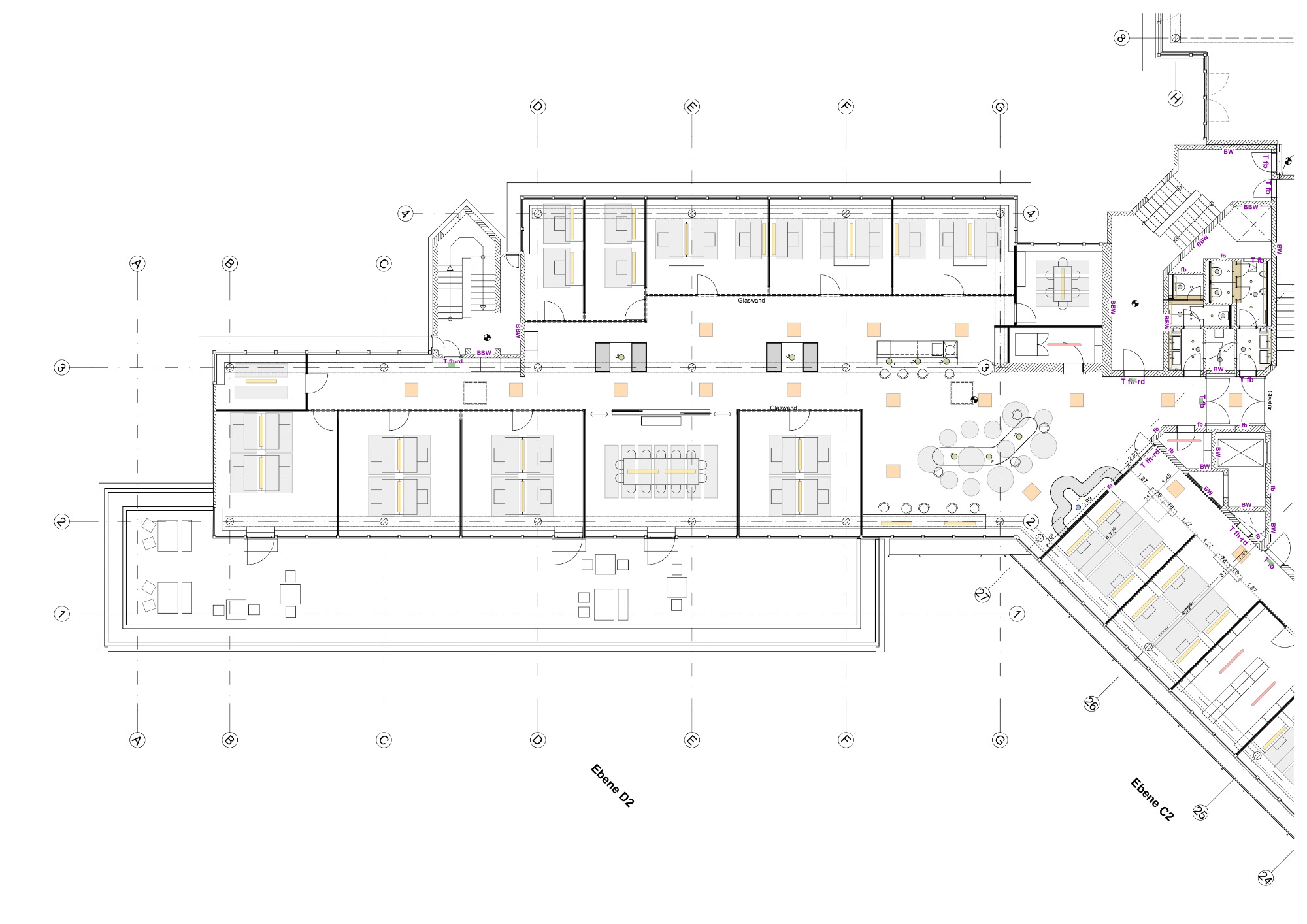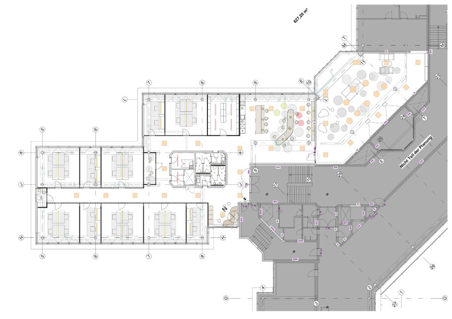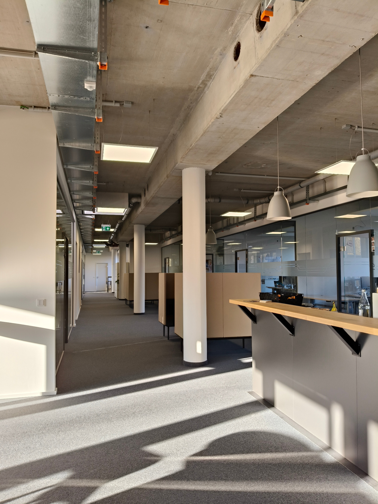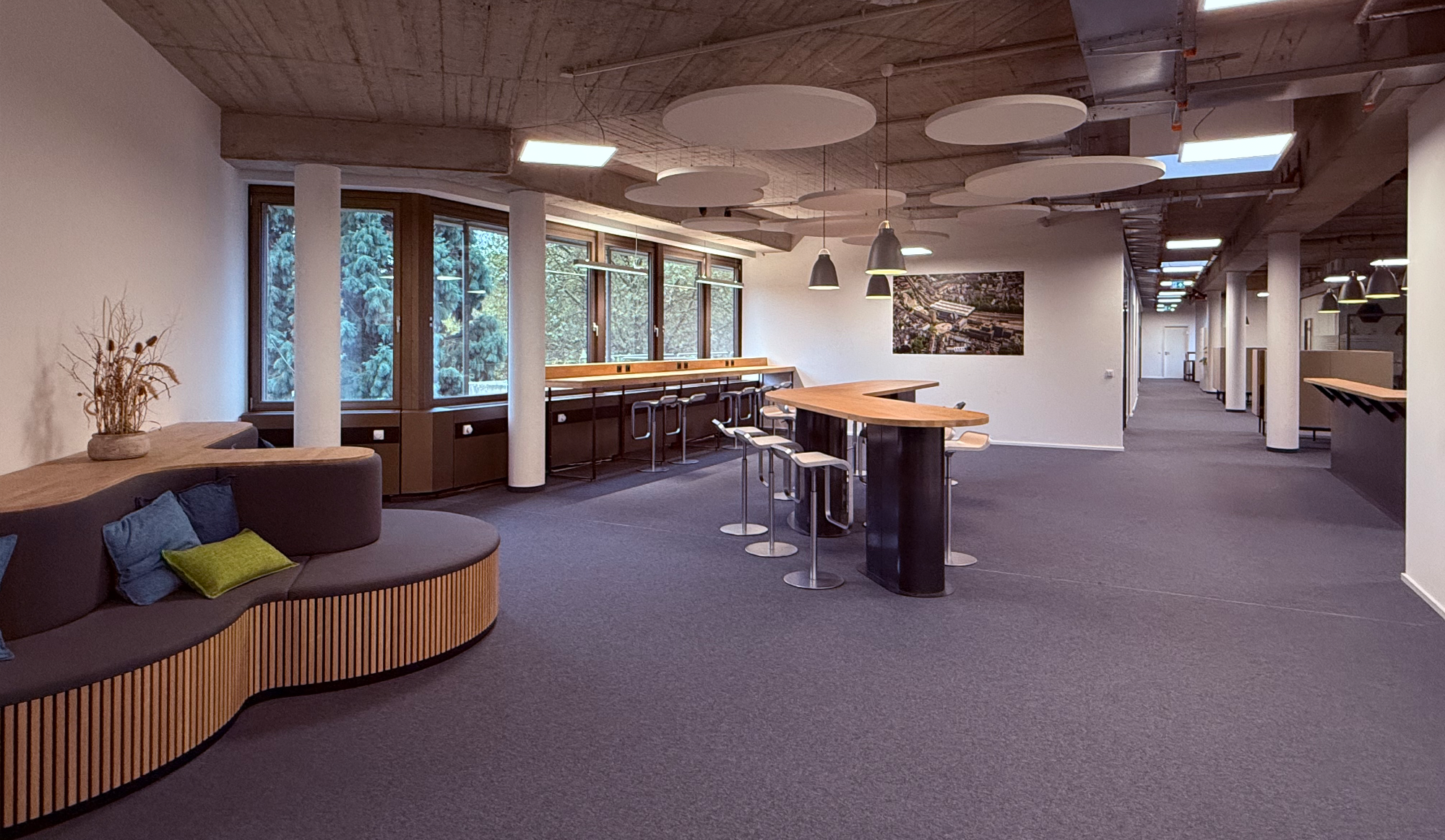 Ein zentraler Bestandteil der Maßnahme ist die Aufwertung der bislang dunklen Flure: Durch neue Glastrennwände entstehen helle, transparente Verbindungen zwischen den einzelnen Bereichen. Neue Gemeinschaftsküchen sowie Sozial- und Produkttesträume schaffen zusätzliche Aufenthalts- und Arbeitszonen, die zeitgemäßen Ansprüchen an eine moderne Arbeitswelt gerecht werden.
