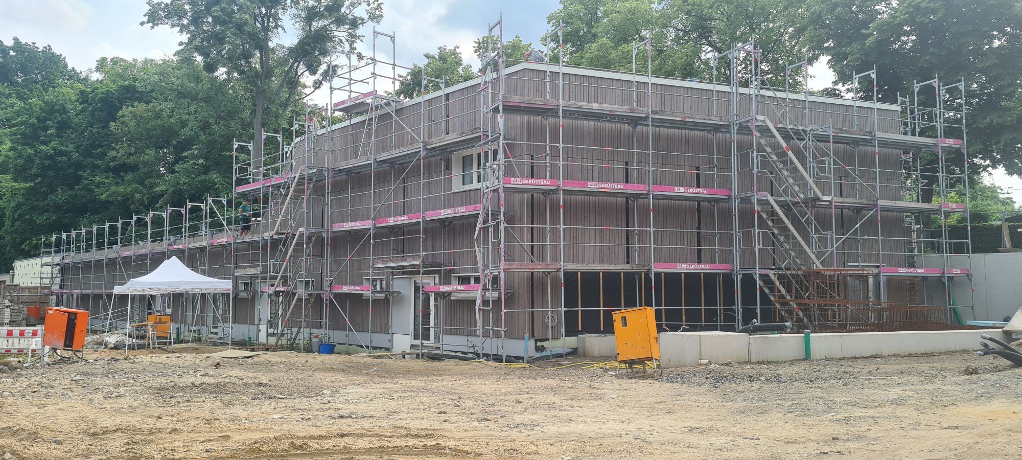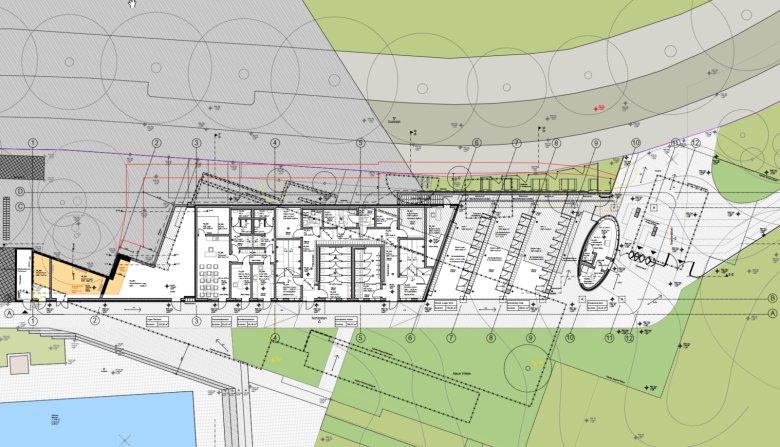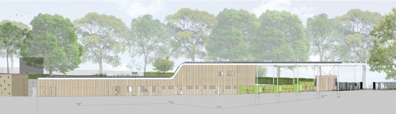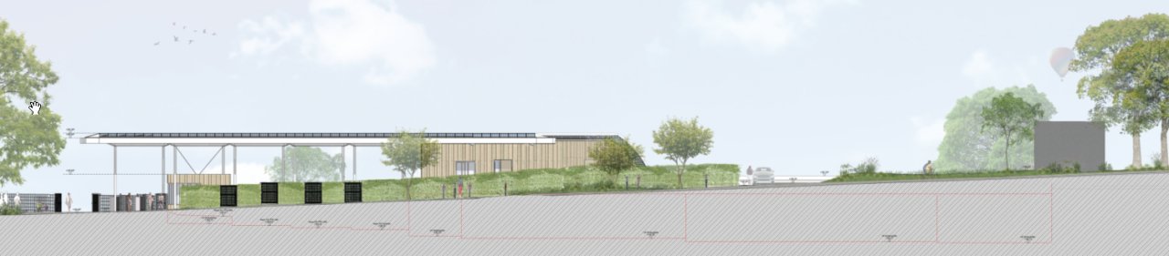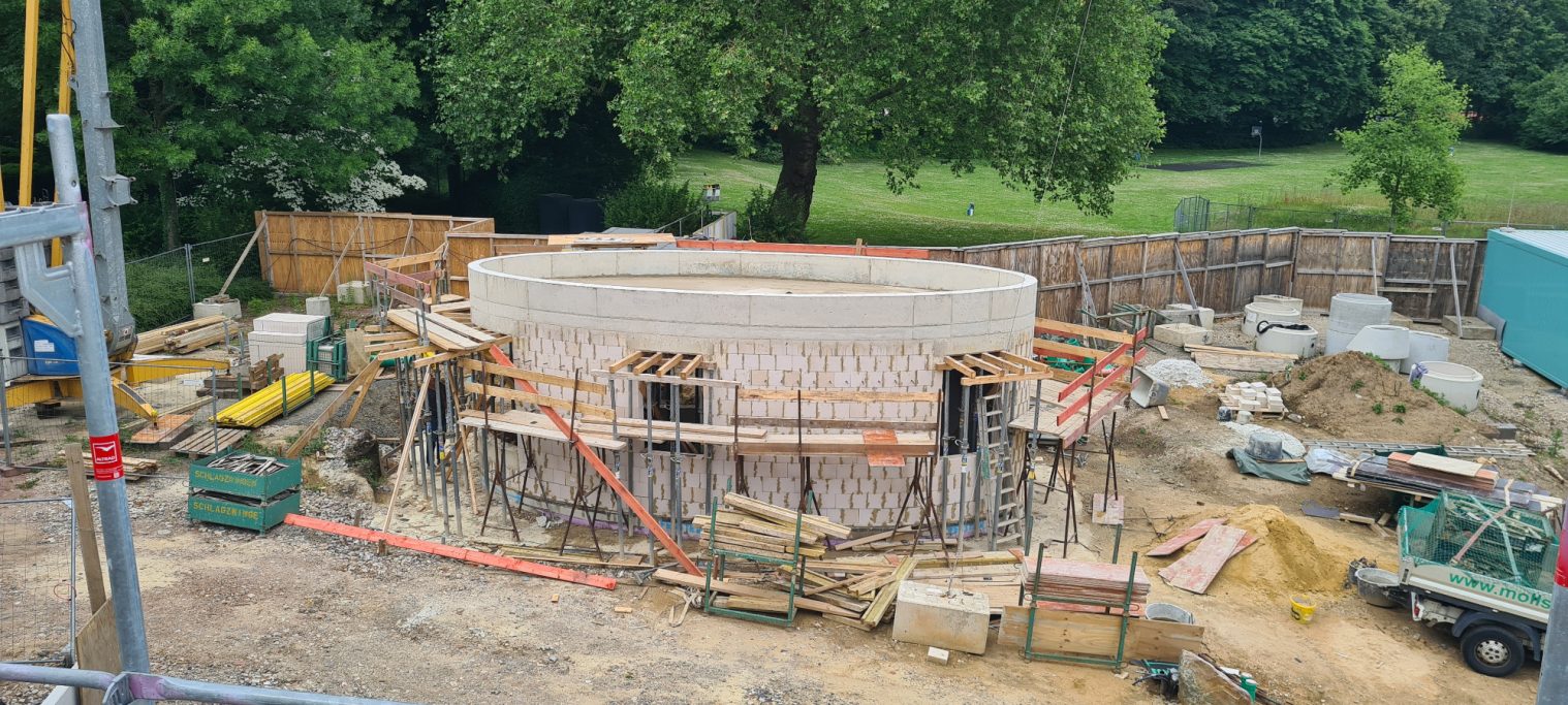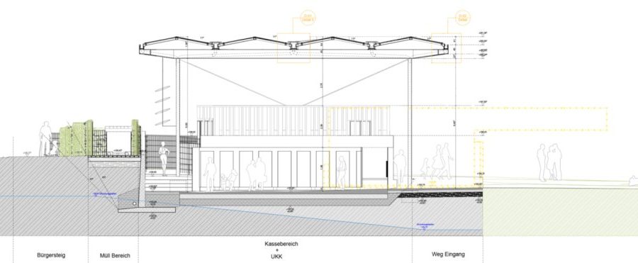 Der geplante Neubau wird mit ca. 2.935 m³ deutlich kleiner als das bestehende Sozialgebäude ca.5.726 m³. Die Summe aller versiegelten Flächen (bebaute Flächen, überdachte Flächen, gepflasterte Flächen) fällt mit ca. 1.901 m² um fast 307 m² geringer aus als im heutigen Bestand (2.208 m²).