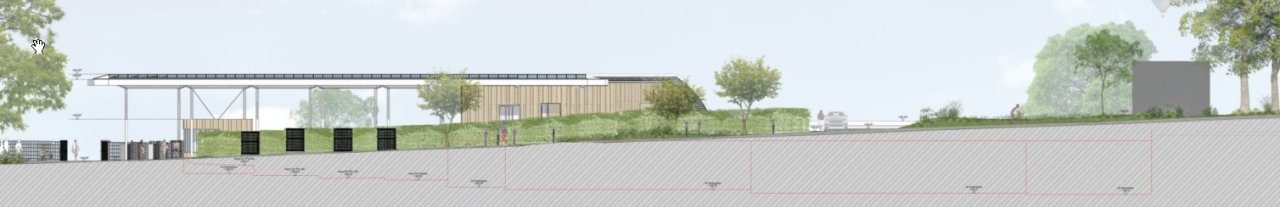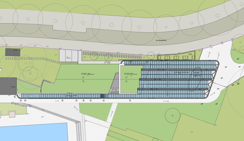 Während die Straße Am Hangeweiher von Norden nach Süden ansteigt, fällt das Freibadgelände von Norden nach Süden ab. Dadurch entsteht zwischen der Straße Am Hangeweiher ein vom Freibadeingang bis zum bestehenden Technikgebäude ansteigender Hang. Diese Hangsituation wird genutzt, um den Neubau im Süden auf der Grundfläche des Altbaus einseitig in den Hang zu schieben. Dabei werden die bestehenden Außenwände als Böschungssicherung unterhalb der schützenswerten Bäume genutzt. Das Gelände läuft hier auf dem begrünten Dach des eingeschoßigen Bauteils aus und ermöglicht, dass die Kubatur in diesem Bereich, bis auf den Zugang zur Hausmeisterwohnung, von der Straße kaum wahrnehmbar ist.