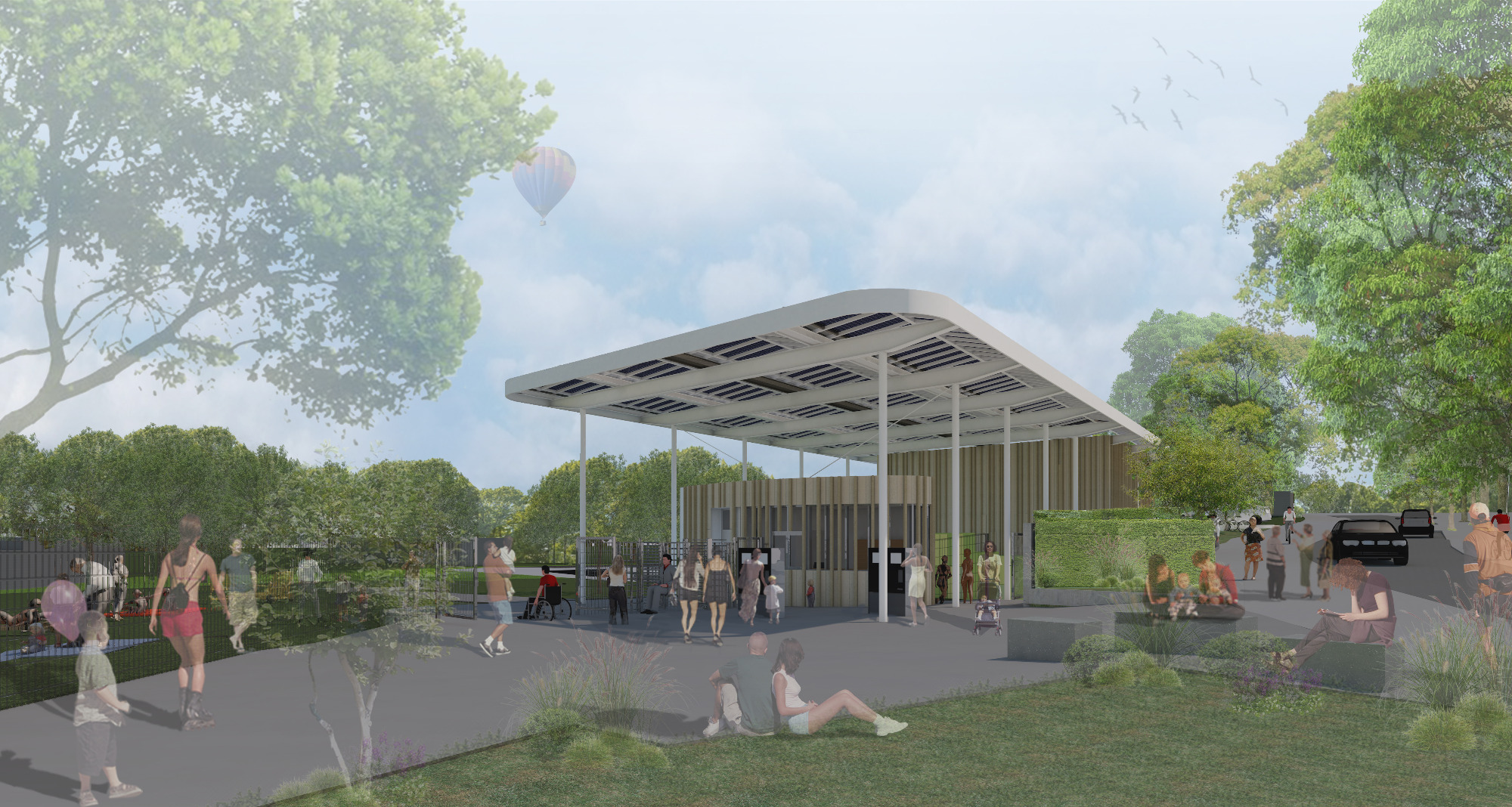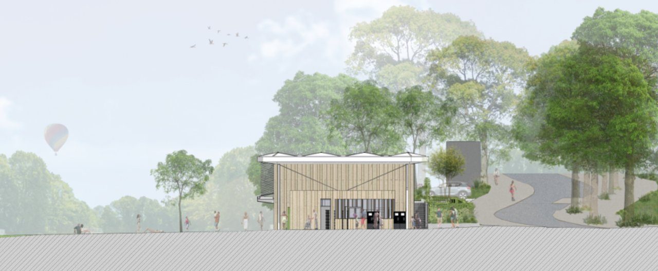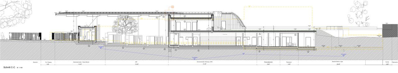 Der geplante Neubau sieht eine Reduzierung der Gebäudekubatur und eine Neuordnung des Kassenbereichs vor. Ein luftiges Dach schützt den Eingangsbereich, die daran anschließenden Einzelumkleidekabinen und die Schließfächer im Freien. Das nur noch ein- bis zweigeschoßige Sozialgebäude beherbergt die Behinderten- und Sammelumkleiden und Toiletten, sowie die Duschräume. Alle Büro- Soziall- und Lagerräume sind im Erdgeschoß untergebracht. Nur die Schwimmmeisterwohnung befindet sich im ersten Obergeschoß. Die Planung berücksichtigt für den Freibad-besucher*innen eine barrierefreie Zugänglichkeit aller Funktionsbereiche und die Anfahrbarkeit für Rettungsfahrzeuge.
