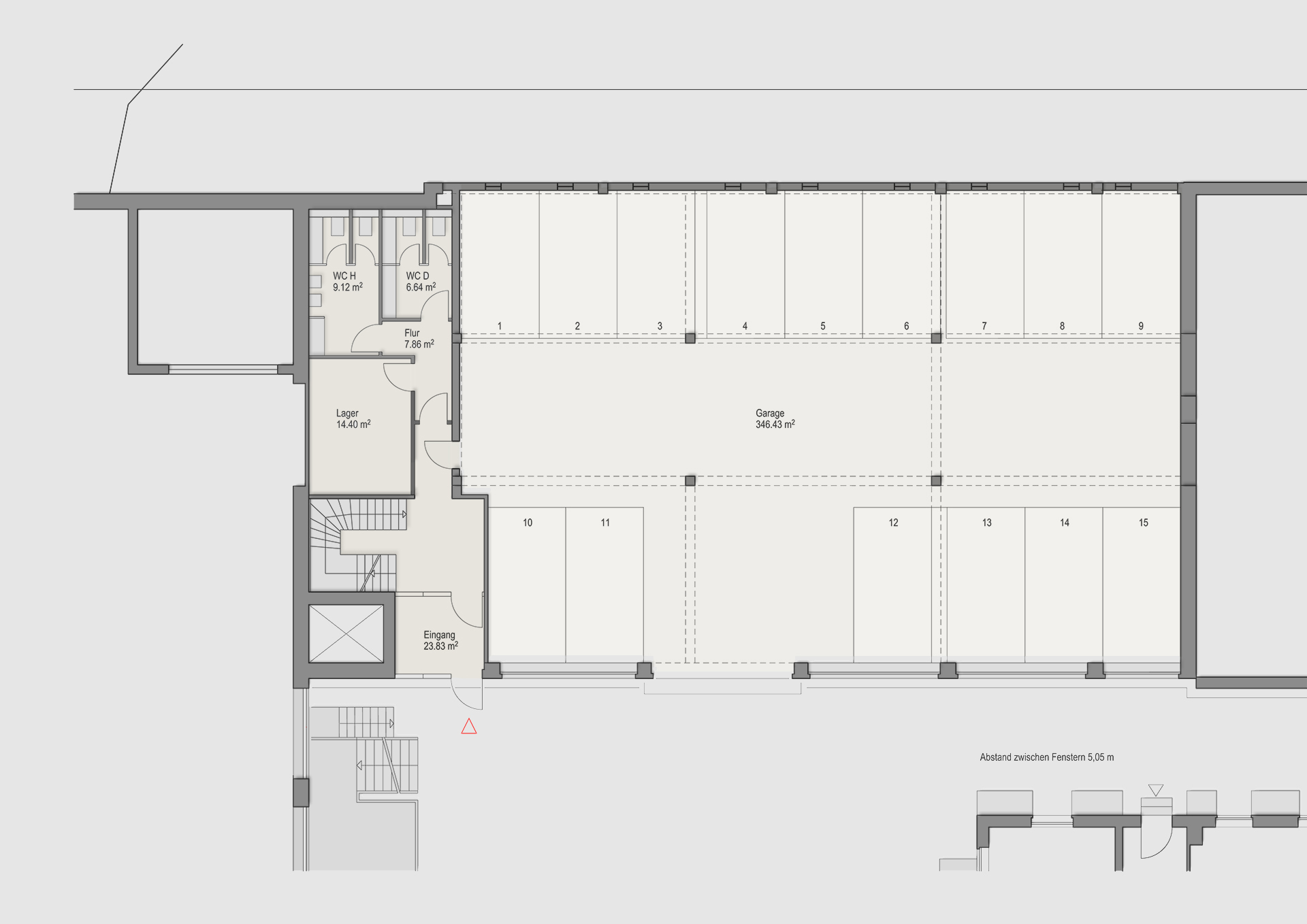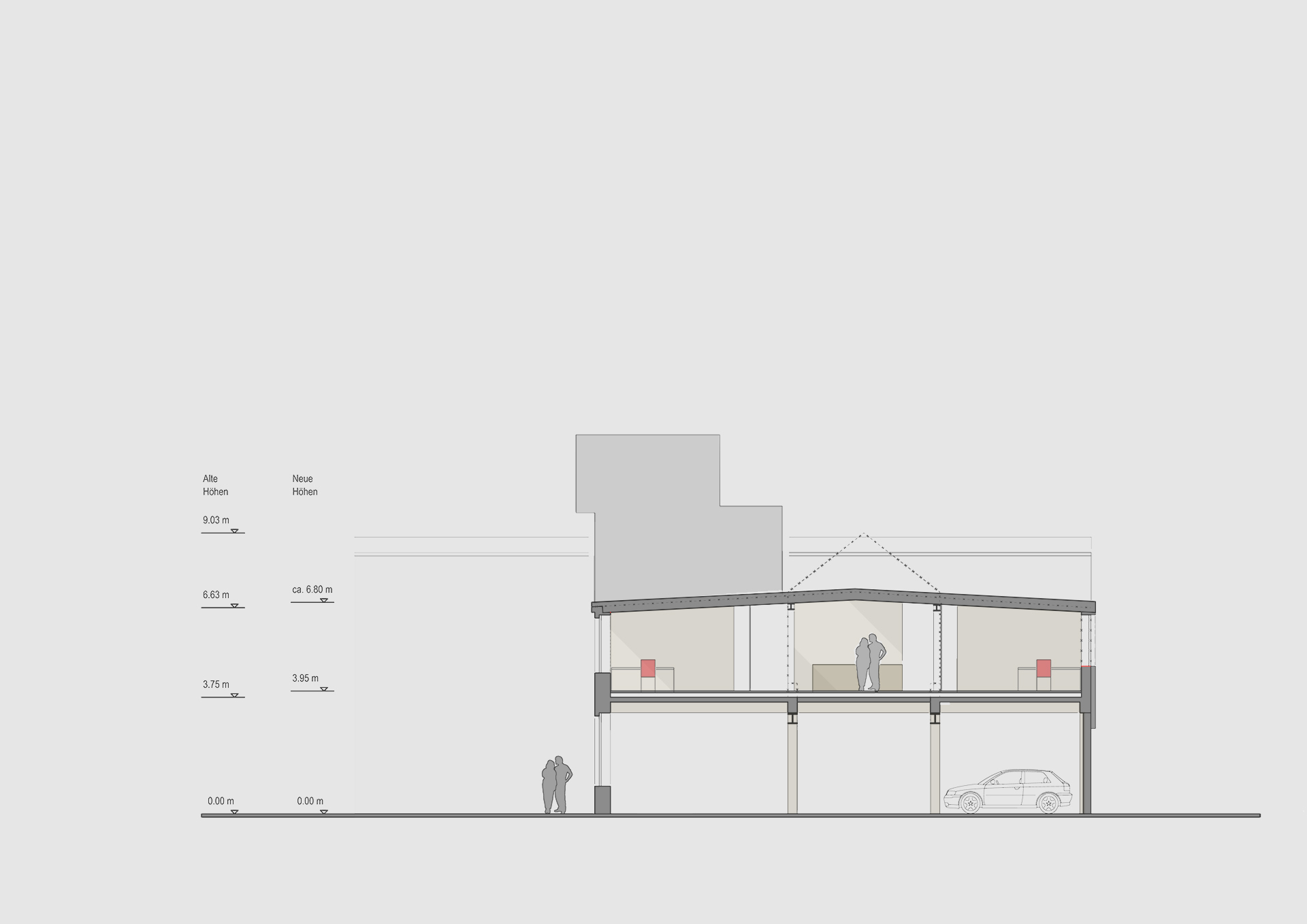 Durch den Abriss der angrenzenden Sheddachhalle (Halle 2) und die Neubebauung des Nachbargrundstücks sind bauliche Anpassungen an der Halle 1 erforderlich, die zugleich eine veränderte Nutzung des Obergeschosses ermöglichen. So besteht im Erdgeschoss die Notwendigkeit, die Parkgarage nach Abriss der Nachbarbebauung – bis auf Lüftungsöffnungen und Fluchtwege zum angrenzenden Grundstück – zu schließen. Das bisher als Atelier vermietete Obergeschoss kann zukünftig durch den Einbau von Fenstern auch von der Südseite belichtet werden.