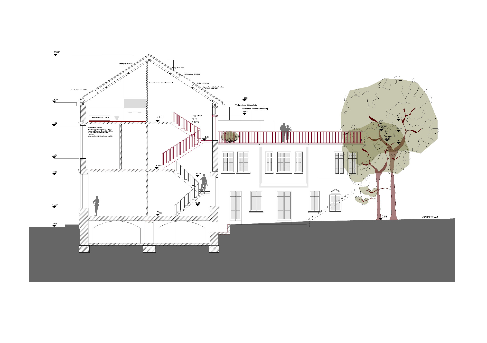 Das zweigeschossige Haupthaus in der Harscampstrasse 11 verfügt über zwei Wohnungen, die an einem großzügigen Treppenhaus liegen. Zudem befindet sich eine dritte Wohnung im zweigeschossigen hinteren Anbau. Der Bauherr wollte die Anlage um eine vierte Wohnung im geräumigen Dachgeschoß erweitern. Für diese Wohnung sollte eine Terrasse auf den Bestandsanbau vorgesehen werden. Die Planung wurde im Vorfeld der Unteren Denkmalbehörde vorgestellt und mit dieser abgestimmt.