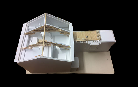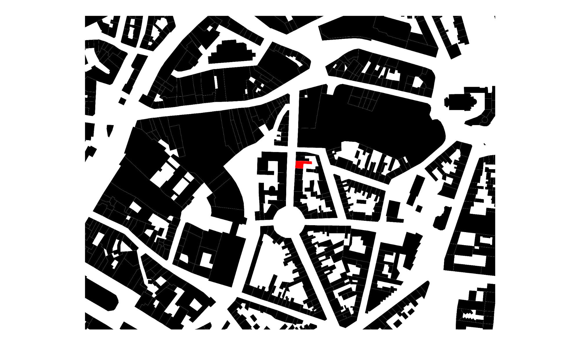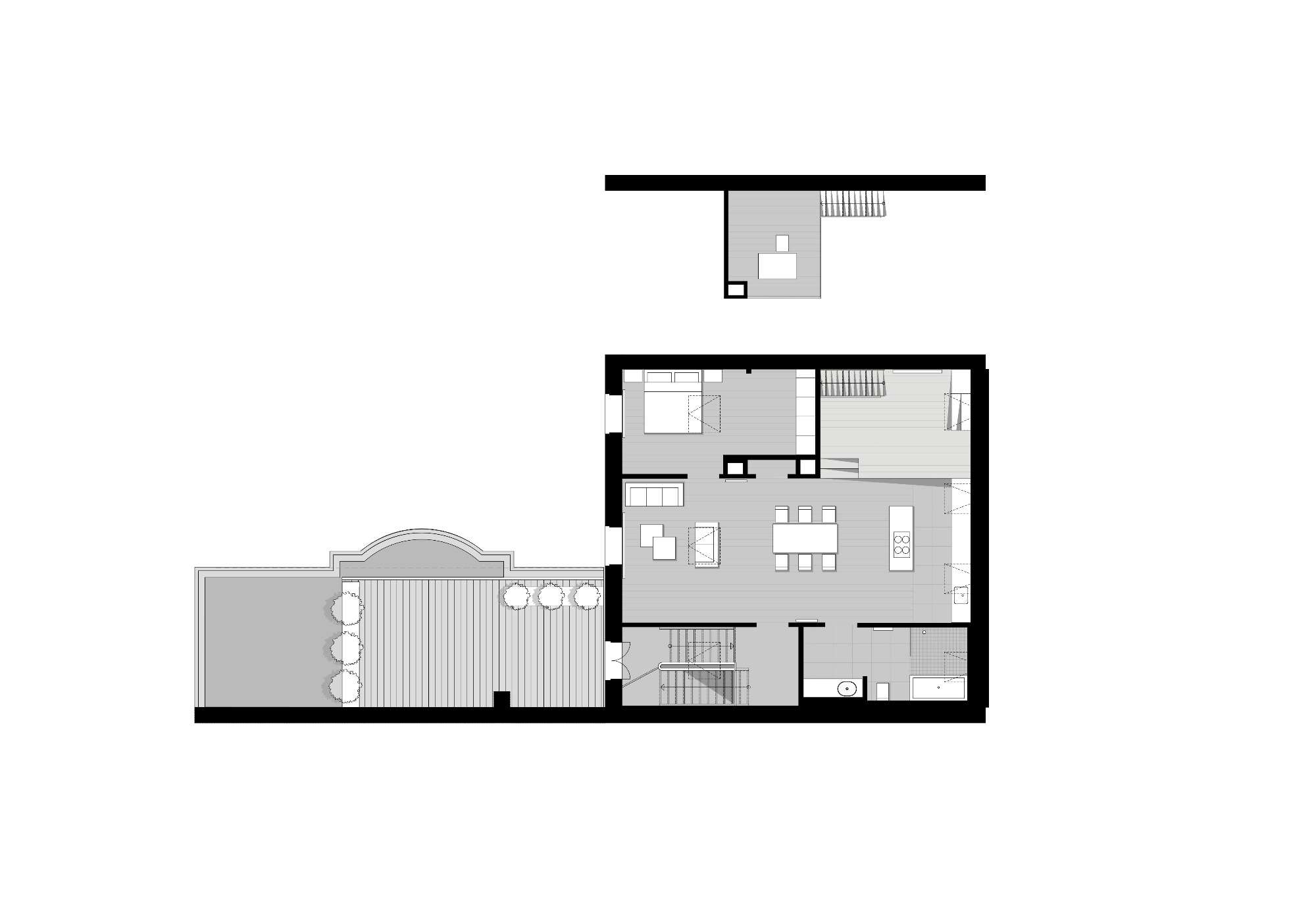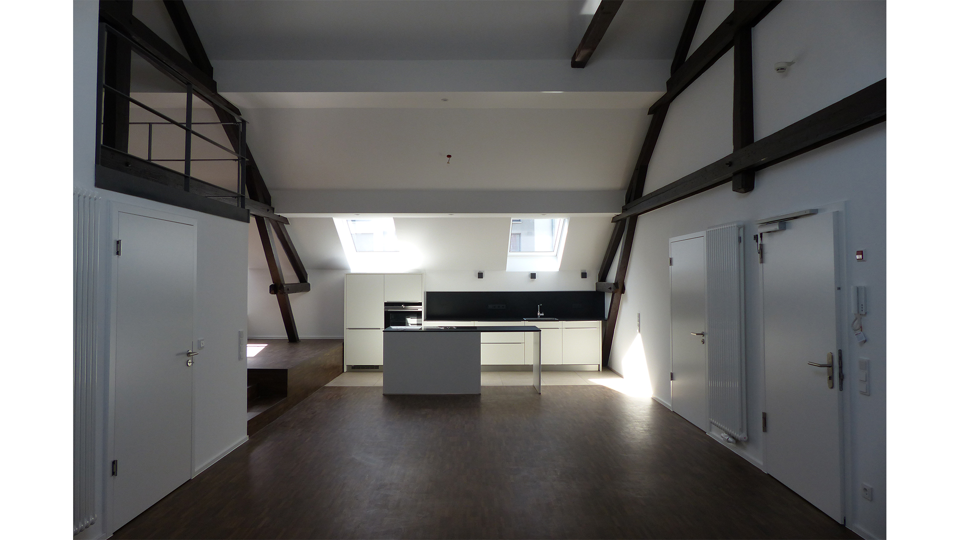 Um die Wohnung im Dachgeschoss zu erschließen, musste das bestehende Treppenhaus um eine zweiläufige Treppe erweitert, sowie ein neuer Deckendurchbruch erstellt werden. Von der neu entstandenen Flurfläche aus betretet man das geräumige Wohnzimmer, an dem straßenseitig eine offene Küche anschließt. Aus dem Wohnzimmer erschließt man das große Bad, das Schlafzimmer mit Ankleide und eine kleine Podest-Empore. Diese strukturiert den Raum, gibt ihm eine zweite Ebene und dient gleichzeitig dazu das hochliegende Rettungswegfenster an der Straße zu erreichen. Von der Podest-Empore aus geht eine kleine Treppe zu einer Arbeitsempore, die sich über der Ankleide befindet, hoch.