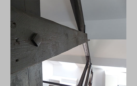 Die Wohnung musste zum Treppenhaus hin mittels einer F90 Konstruktion abgeschottet werden. Eine massive Wand durfte hier aus statischen Gründen nicht gebaut werden. Eine F90 Trockenbauwand muss auf einer F90 Unterkonstruktion liegen, so dass diese nicht auf die Bestandsholzdecke gestellt werden durfte. Als einzig mögliche Lösung wurden mit Brandschutzplatten verkleidete Stahlträger unter den beiden F90 Trockenbauwänden geplant und ausgeführt.