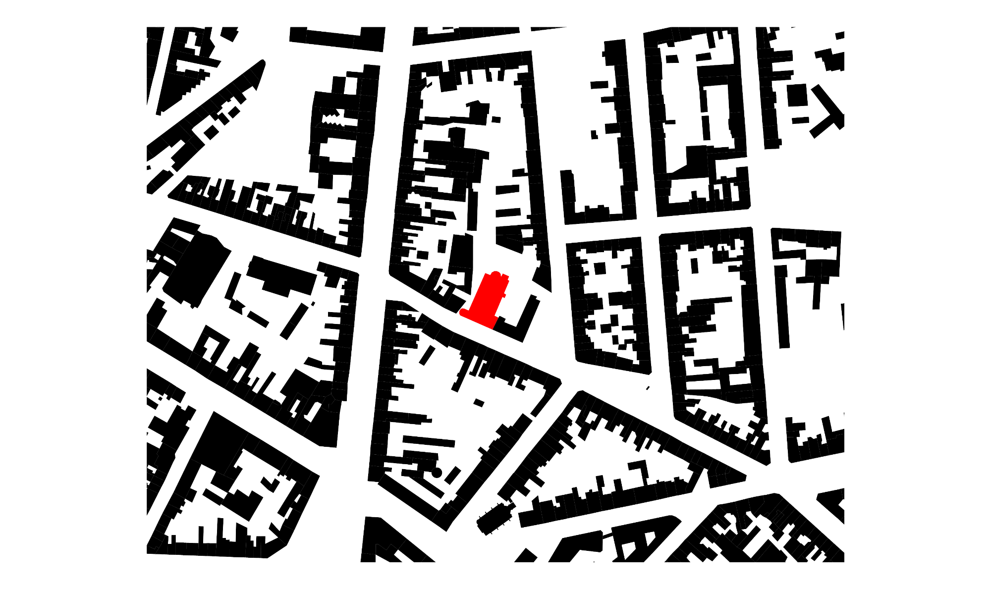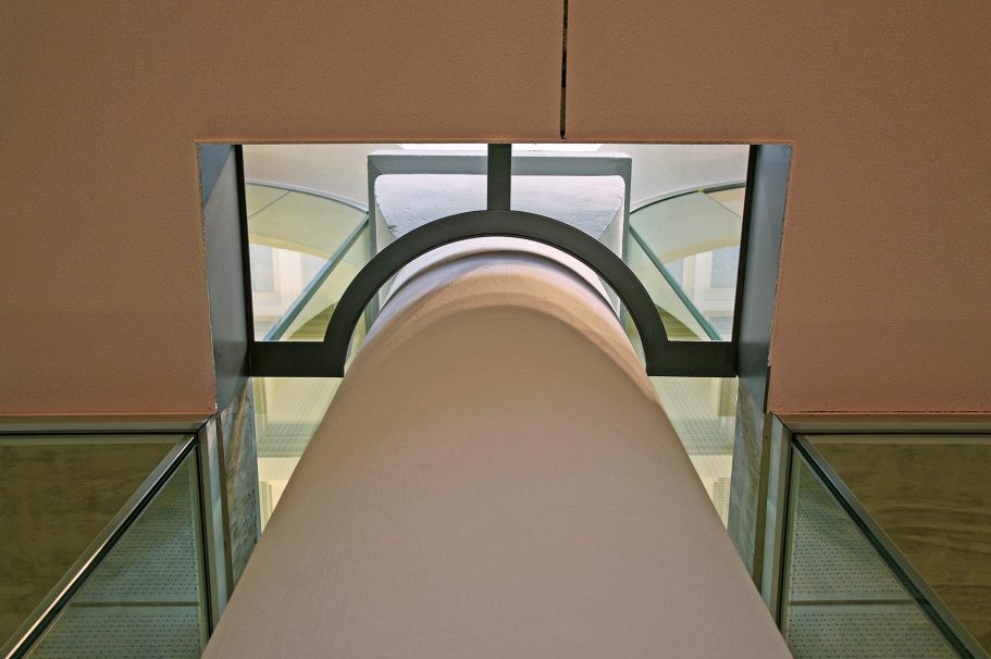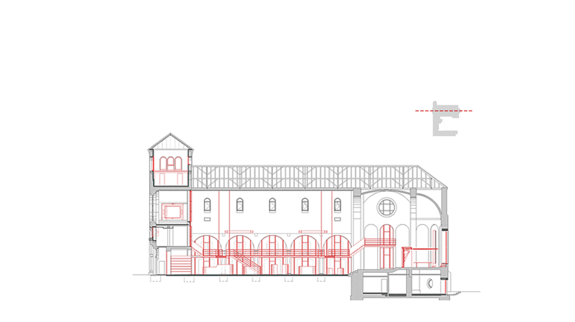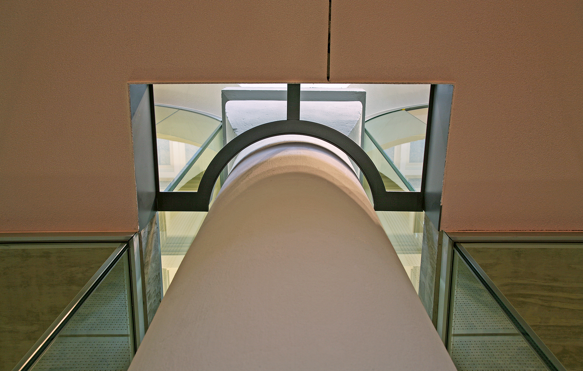 Der denkmalgerechte Umbau stellt die Qualitäten des Altbaus in den Vordergrund und ergänzt die neue Einbauten als eigenständige, reversible Bauteile. Neue Einbauten zeigen sich durch die Material- und Farbgebung als eigenständige Bauteile ohne das Denkmal zu verdecken.