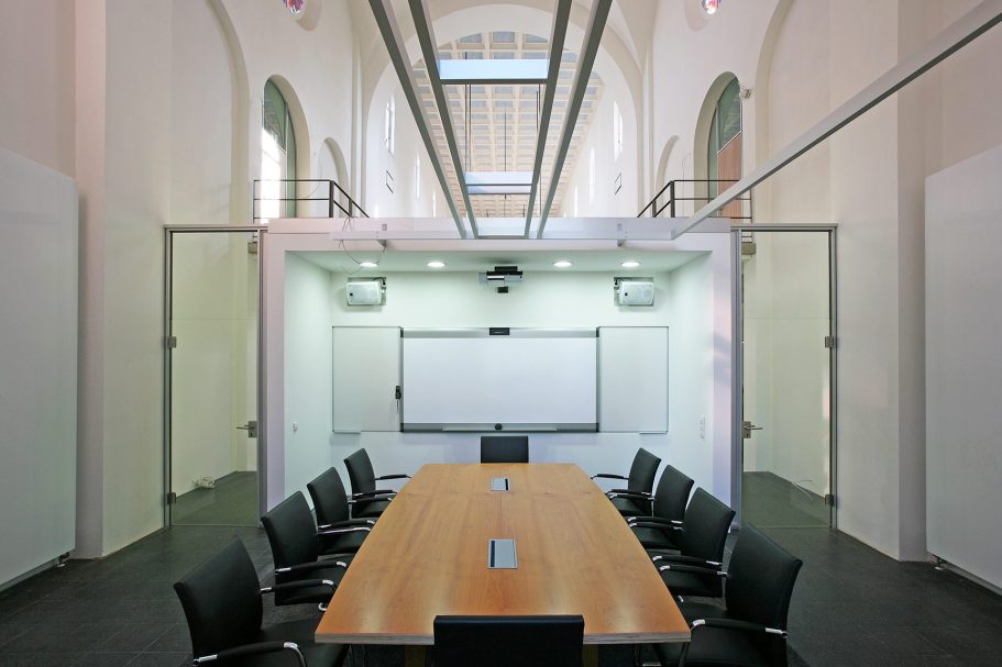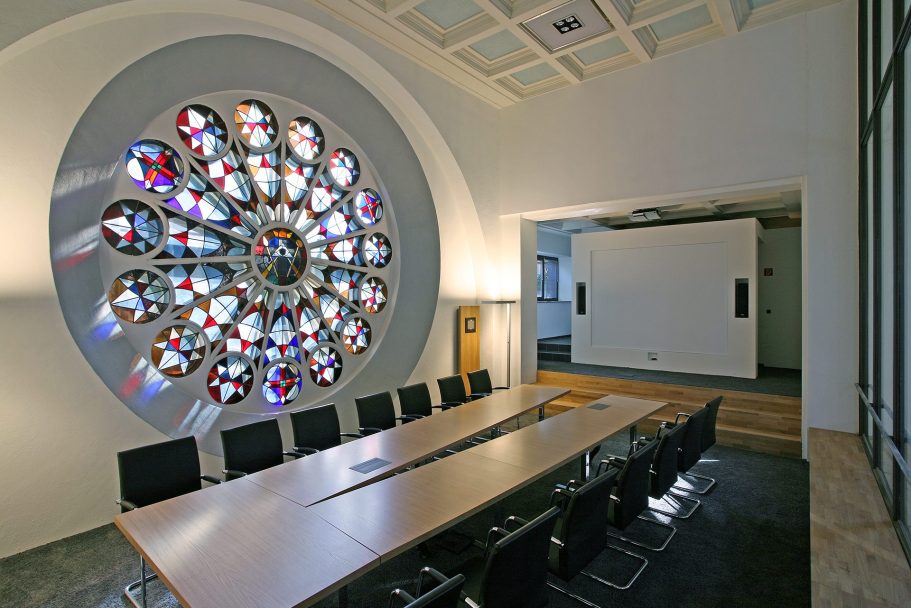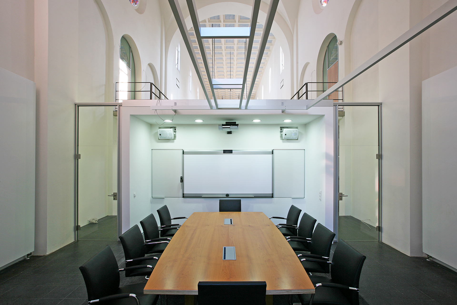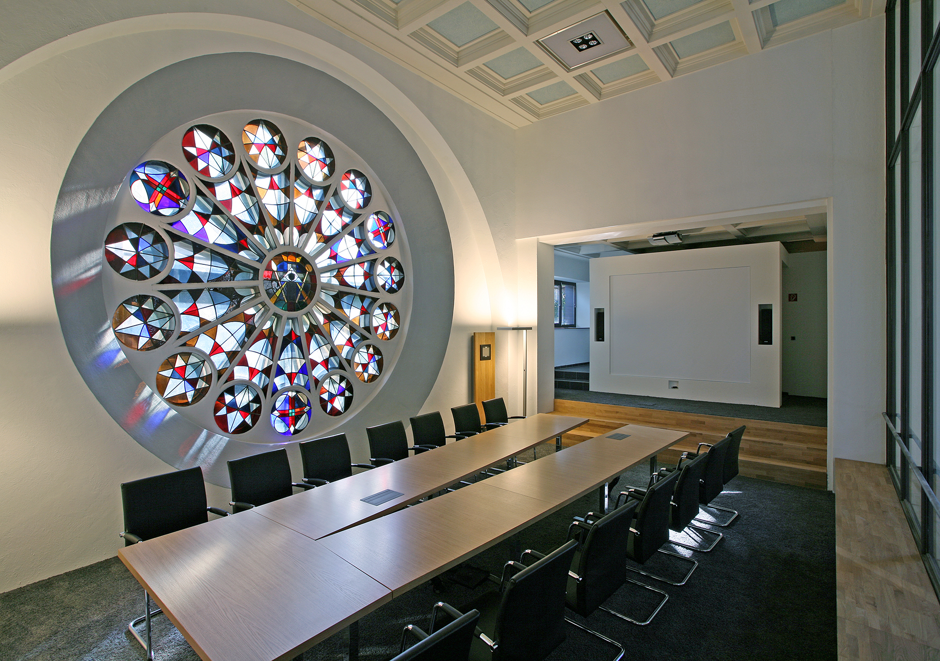 Besprechungs- und Konferenzräume sind in der Apsis, einer ehemaligen Kapelle und unmittelbar unter der Portalrosette untergebracht. Der ausgebaute Raum im Kirchturm ermöglicht zurückgezogenes Arbeiten mit Weitsicht.