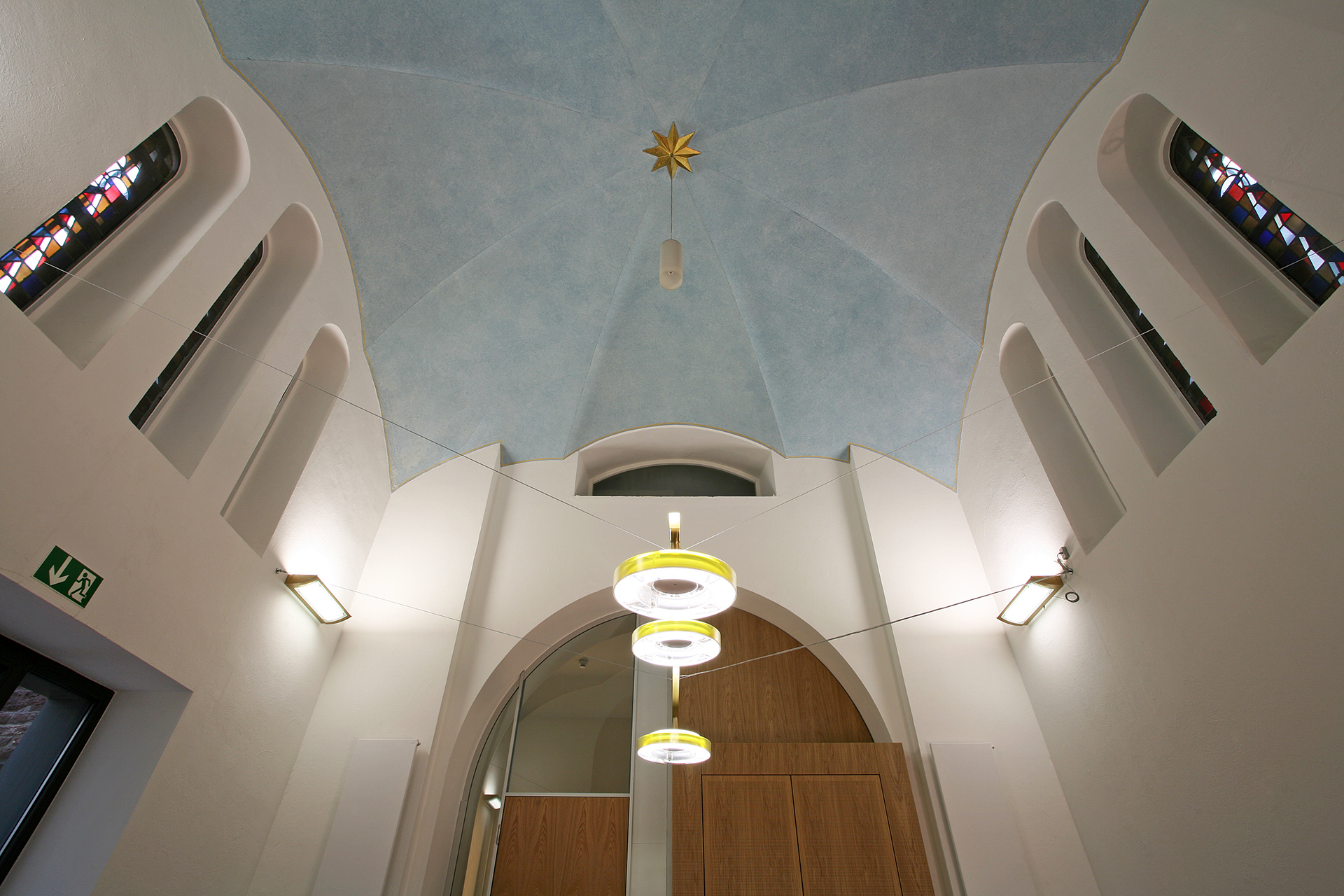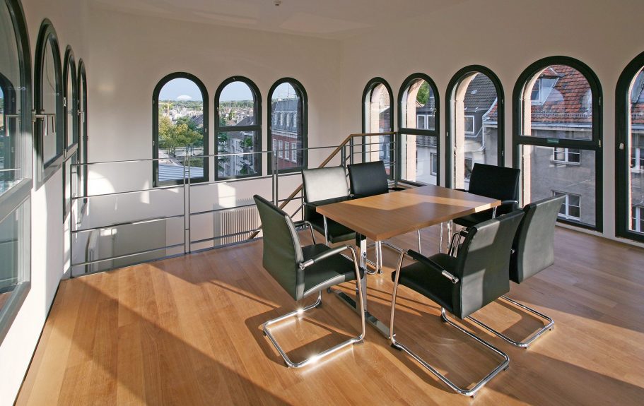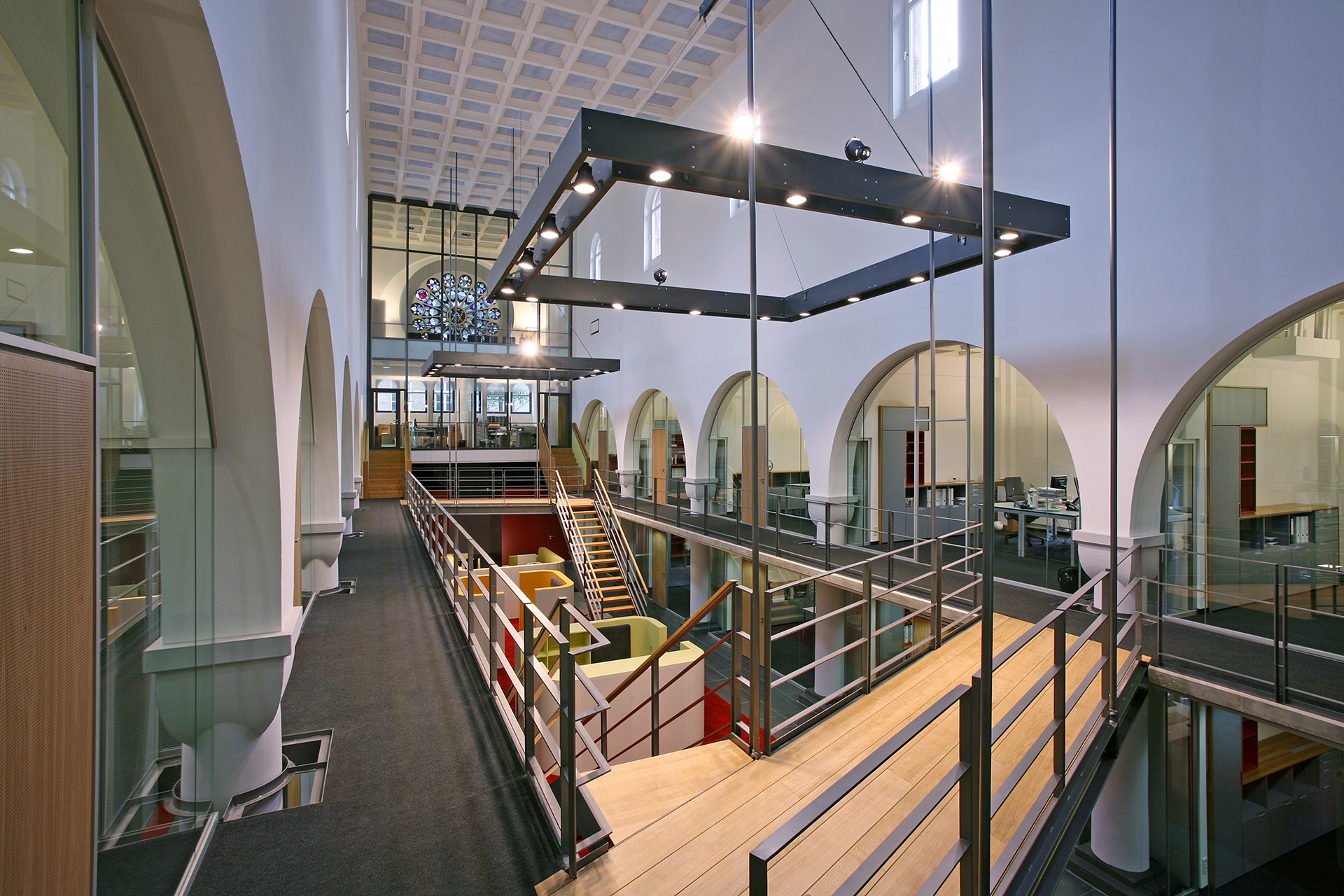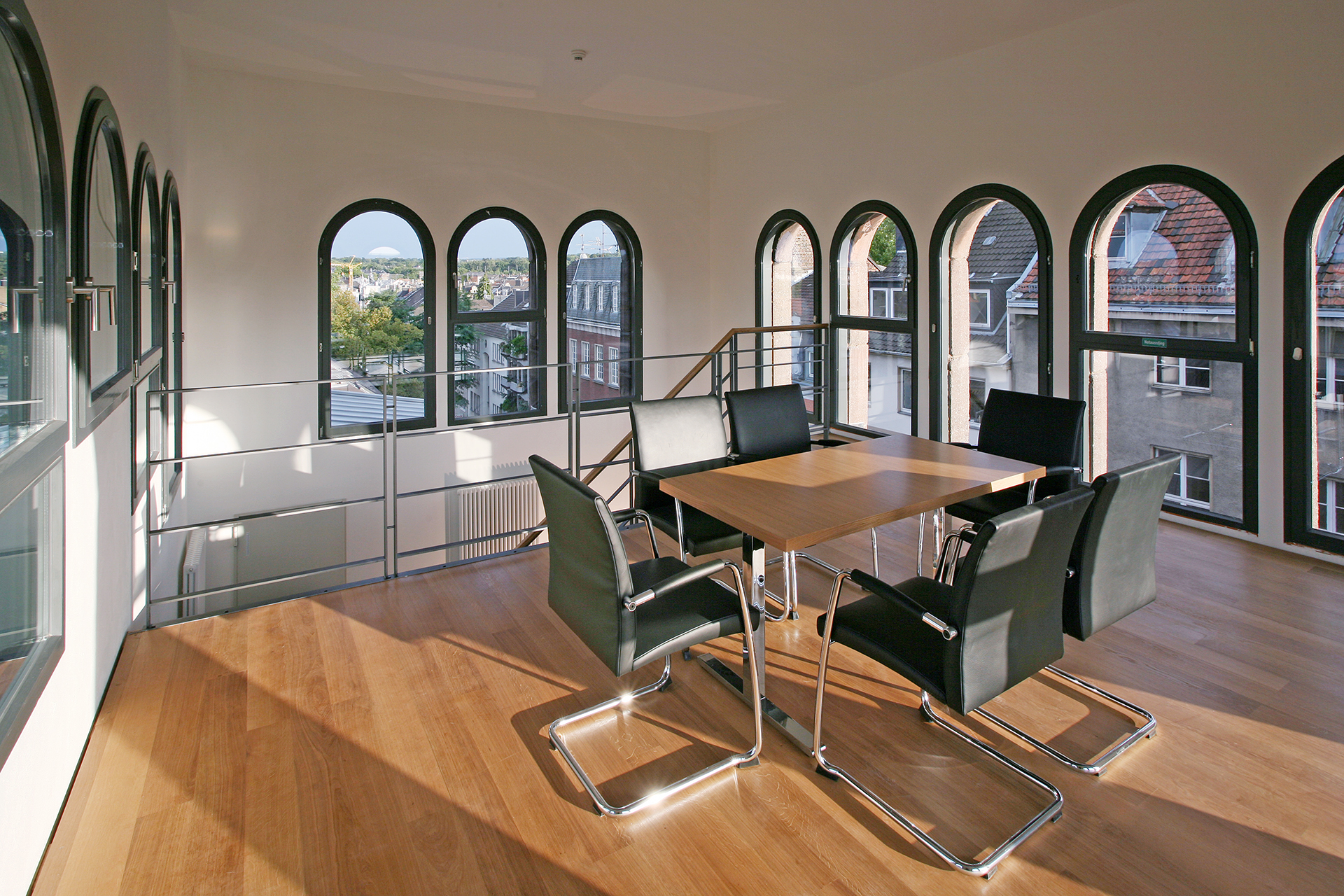 Besprechungs- und Konferenzräume sind in der Apsis, einer ehemaligen Kapelle und unmittelbar unter der Portalrosette untergebracht. Der ausgebaute Raum im Kirchturm ermöglicht zurückgezogenes Arbeiten mit Weitsicht.