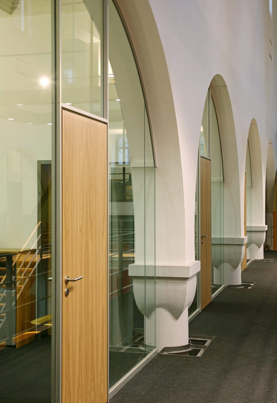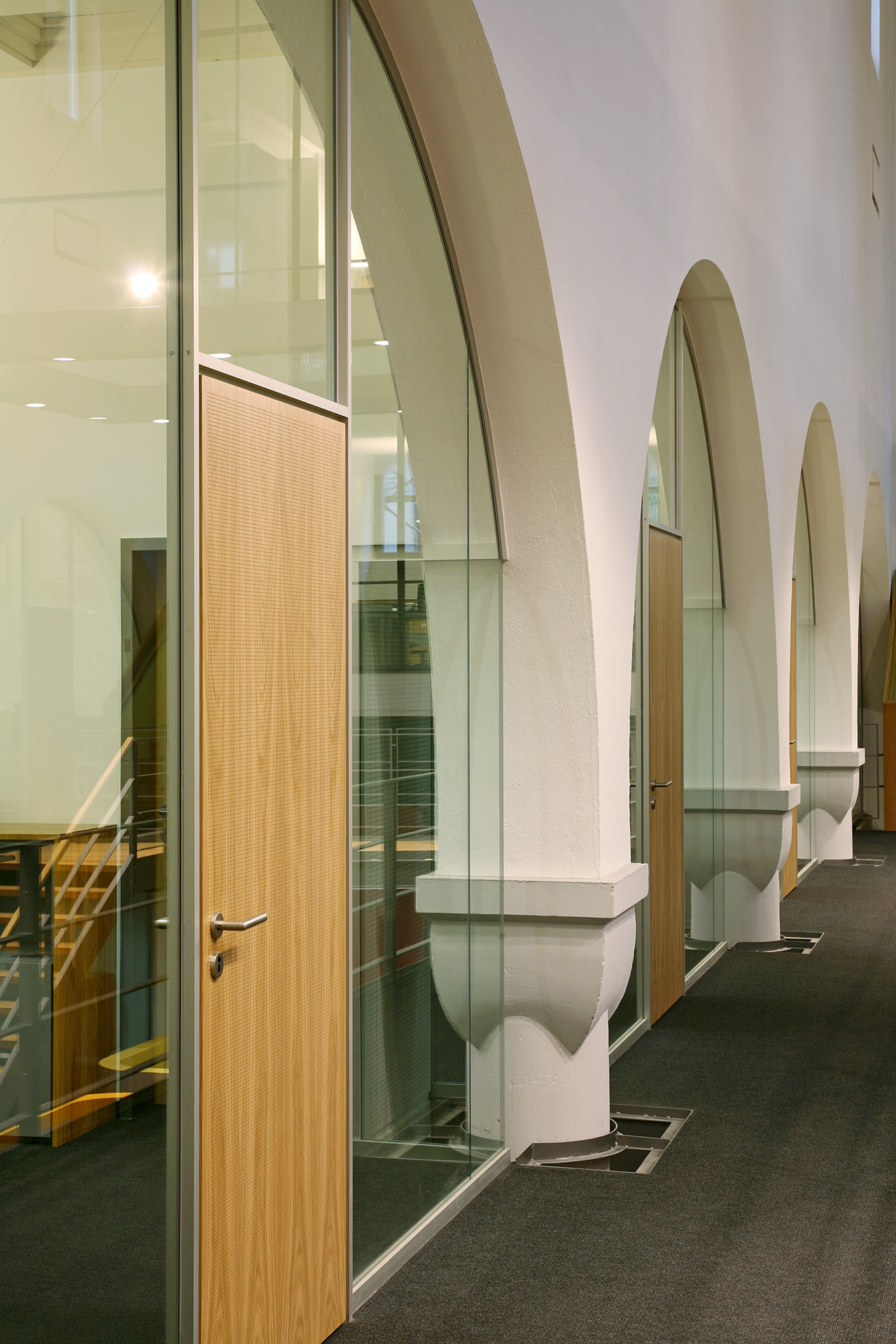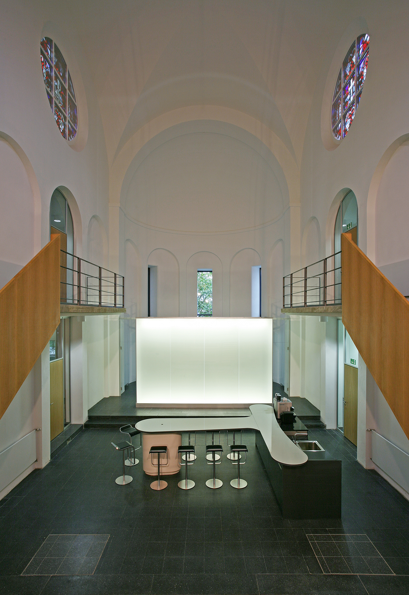 In der Klosterkirche wurde eine zusätzliche Ebene in die Seitenschiffen hineingestellt. Sie ruht auf eigenen Stützen und Fundamenten unabhängig vom bestehenden Denkmal. Glaswände trennen die Einzel- und Doppelbüros in den Seitenschiffen vom ca. 12 Meter hohen Mittelschiff. Das Mittelschiff steht nun als kommunikative Kombizone mit Sitznischen, Druckerpoint, Zeitschriftenarchiv und Meeting Point im ehemaligen Chor allen Büromitarbeitern zur Verfügung. Dem Raum wurde durch die veränderte Lichtführung, die reduzierten Einbauten und die Material - und Farbgebung sein sakraler Charakter genommen ohne die beeindruckende Ausstrahlung des Ortes zu schwächen. Stahl, Glas, Sichtbeton aber auch Holz, Textilien und Akustikabsorber sorgen für eine angenehme Atmosphäre mit guter Akustik.
