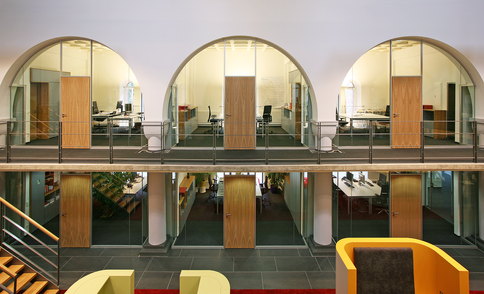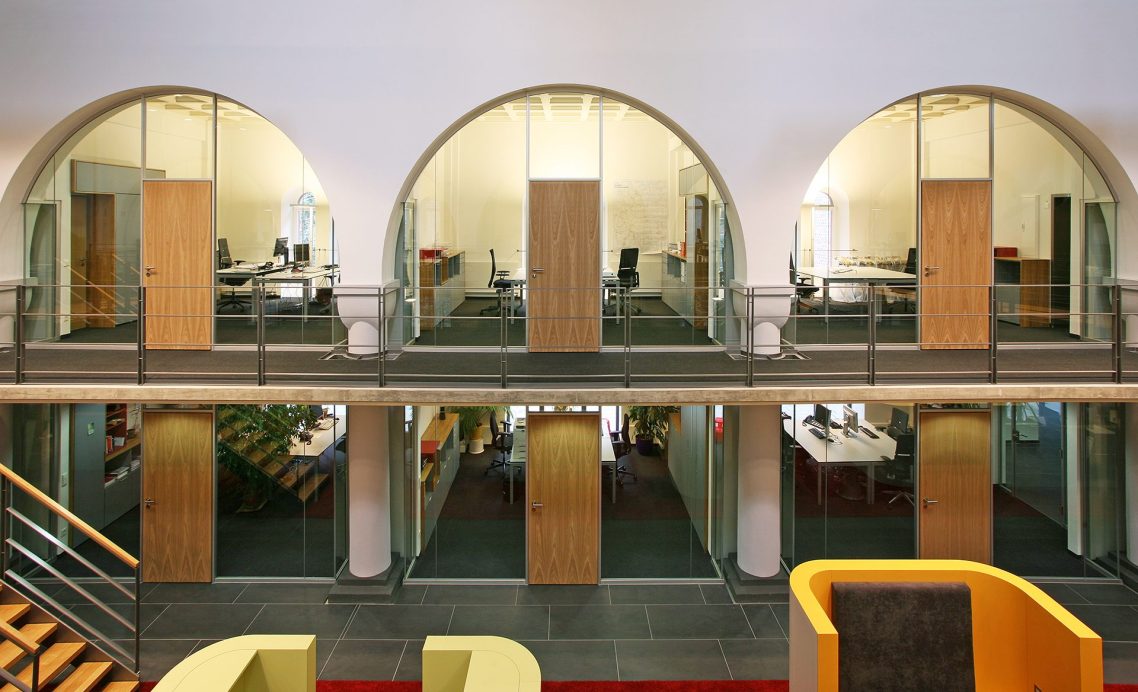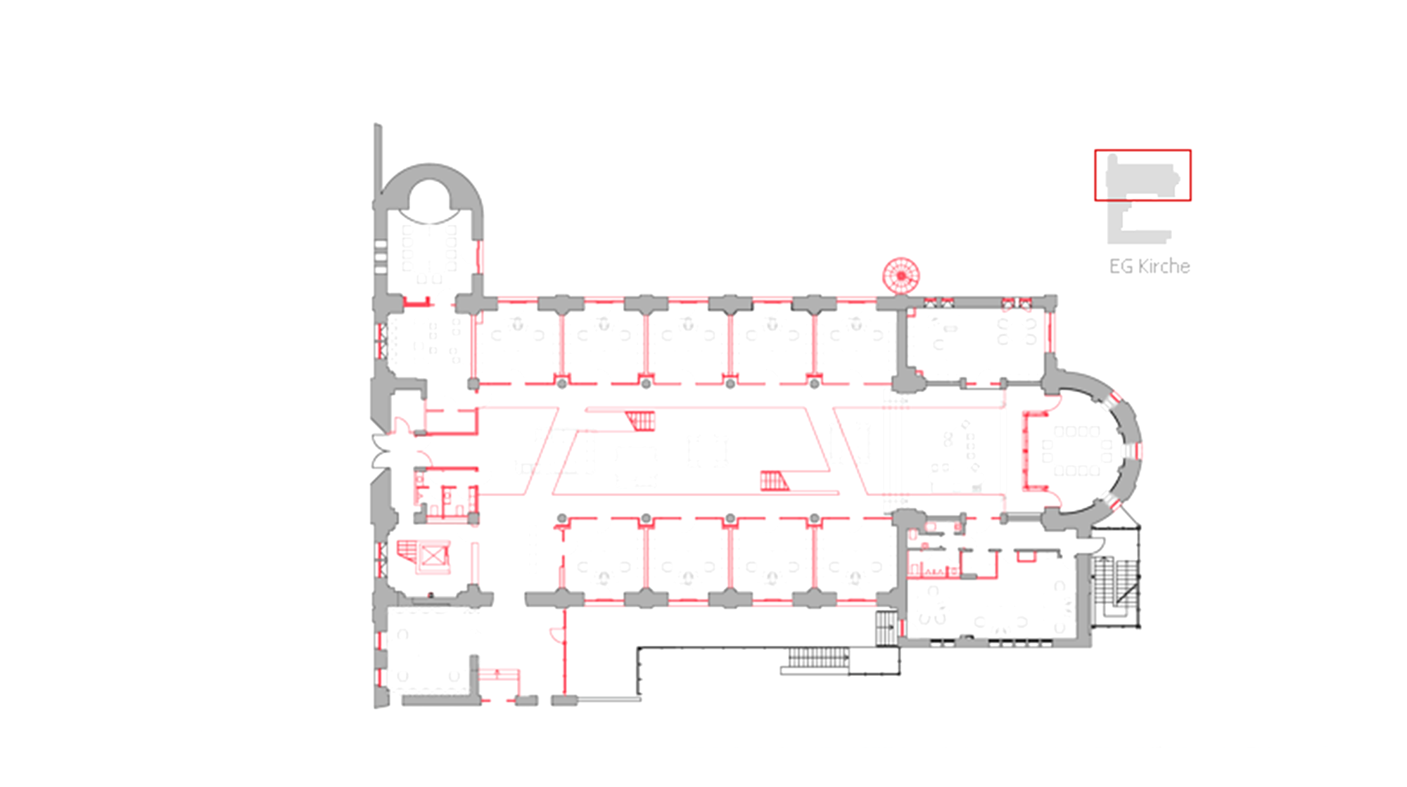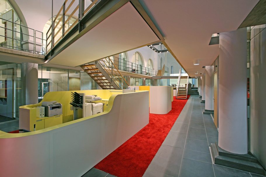 In der Klosterkirche wurde eine zusätzliche Ebene in die Seitenschiffen hineingestellt. Sie ruht auf eigenen Stützen und Fundamenten unabhängig vom bestehenden Denkmal. Glaswände trennen die Einzel- und Doppelbüros in den Seitenschiffen vom ca. 12 Meter hohen Mittelschiff. Das Mittelschiff steht nun als kommunikative Kombizone mit Sitznischen, Druckerpoint, Zeitschriftenarchiv und Meeting Point im ehemaligen Chor allen Büromitarbeitern zur Verfügung. Dem Raum wurde durch die veränderte Lichtführung, die reduzierten Einbauten und die Material - und Farbgebung sein sakraler Charakter genommen ohne die beeindruckende Ausstrahlung des Ortes zu schwächen. Stahl, Glas, Sichtbeton aber auch Holz, Textilien und Akustikabsorber sorgen für eine angenehme Atmosphäre mit guter Akustik.