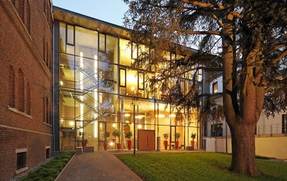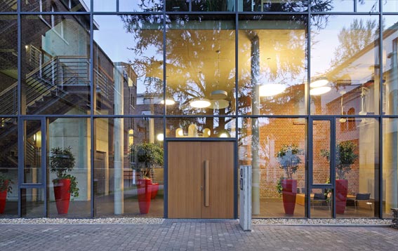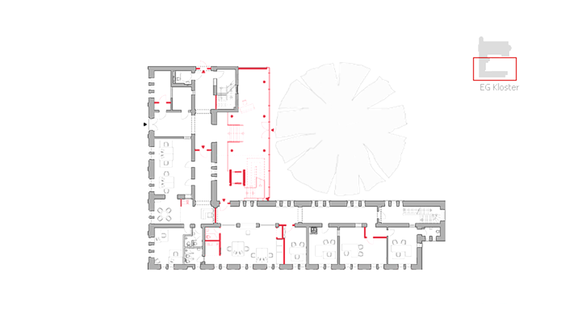 Der Zugang zum Bürogebäude erfolgt durch eine Klostergarten und einer neuen, vor das Kloster gestellten, Glashalle. Diese ‚Vitrine’ dient als Erschließungshalle für alle Büroflächen im Kloster und in der Klosterkirche.