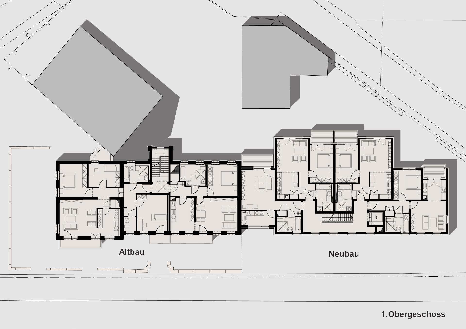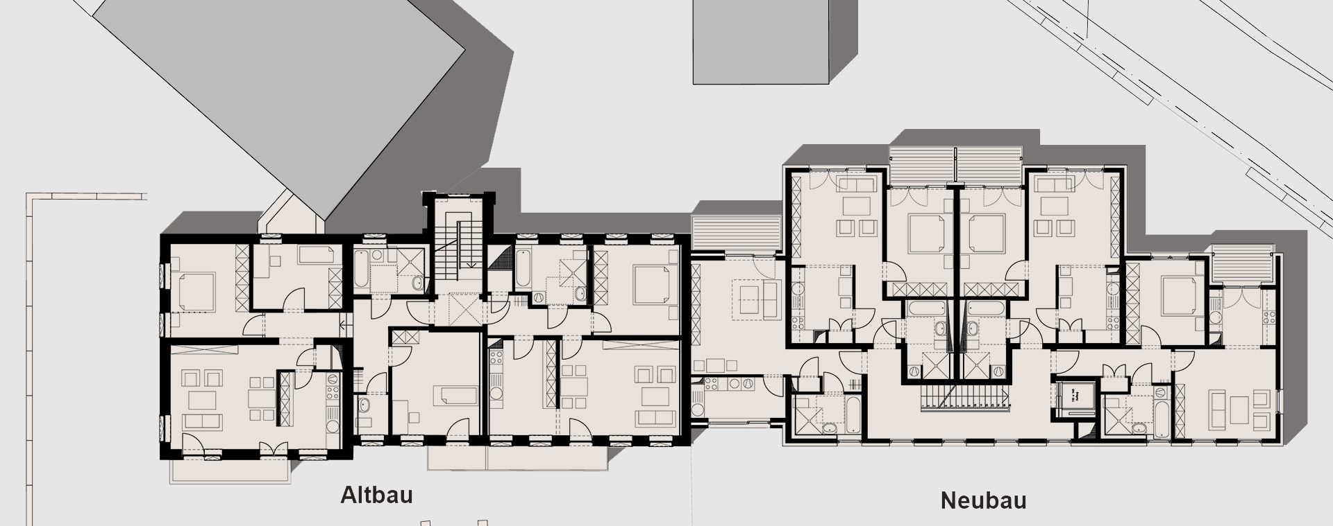 Der Neubau bietet Raum für elf speziell auf die Bedürfnisse älterer Bewohner ausgerichtete Wohnungen. Alle Wohnungen sind mit Balkon oder Terrassen ausgestattet, ein Aufzug führt in alle Etagen des Neubaus. Die Beheizung erfolgt mit einer Erdwärmepumpe.