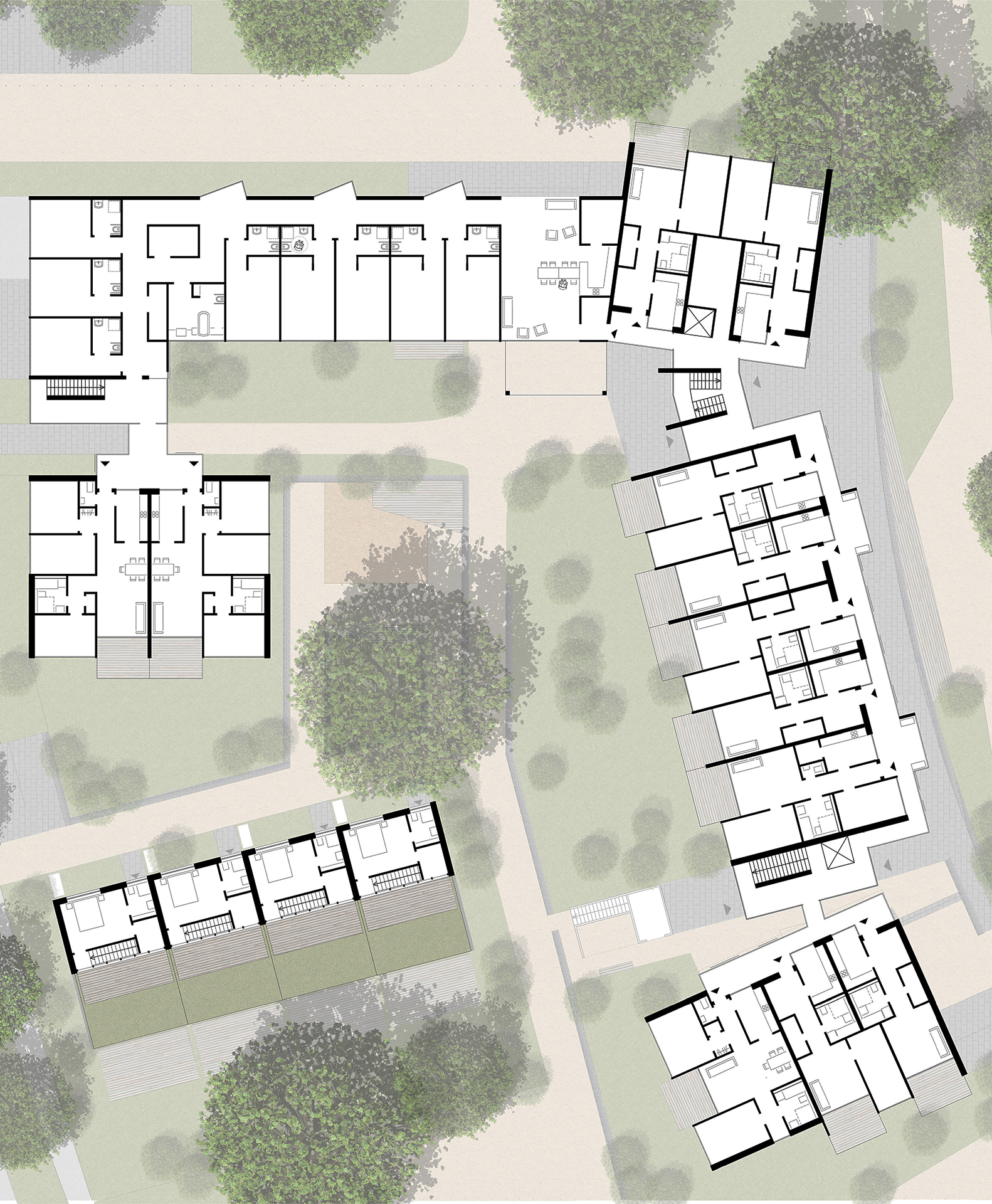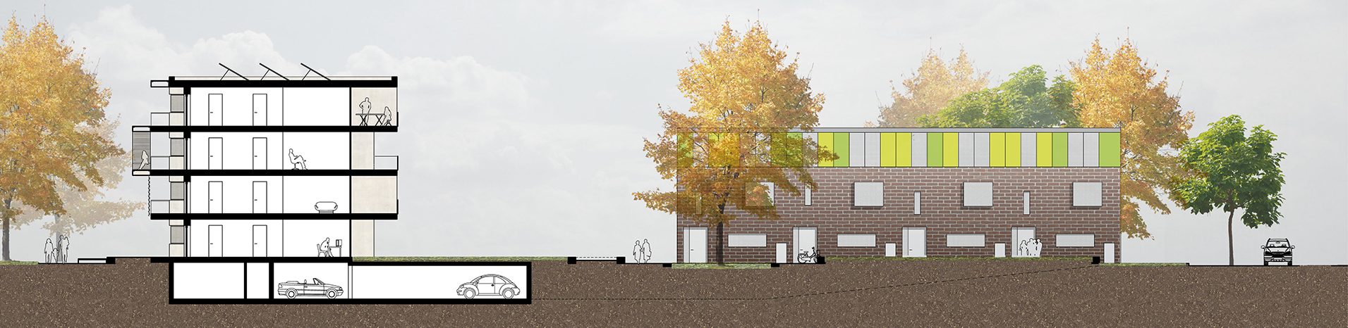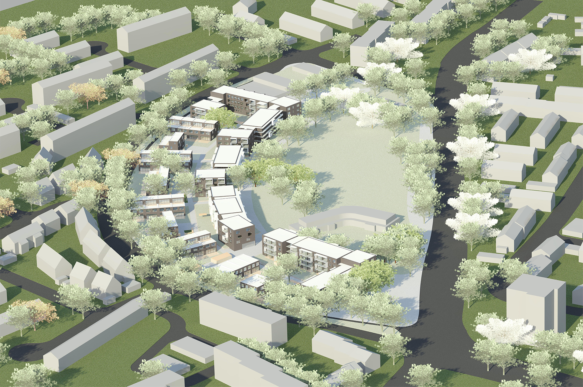 Der städtebauliche Entwurf sieht eine viergeschossige Bebauung entlang der öffentlichen Grünfläche vor und ordnet zweigeschossige Einfamilienhäuser im Innenbereich entlang der Hülchrather Straße an. Es entsteht eine klar definierte Raumkante zur Grünfläche und eineaufgelockerte, Bebauung mit einer Abfolgeunterschiedlicher Platzsituationen zwischen den Geschoß- und Einfamilienhäusern. Die Struktur der Bebauung entlangHülchrather