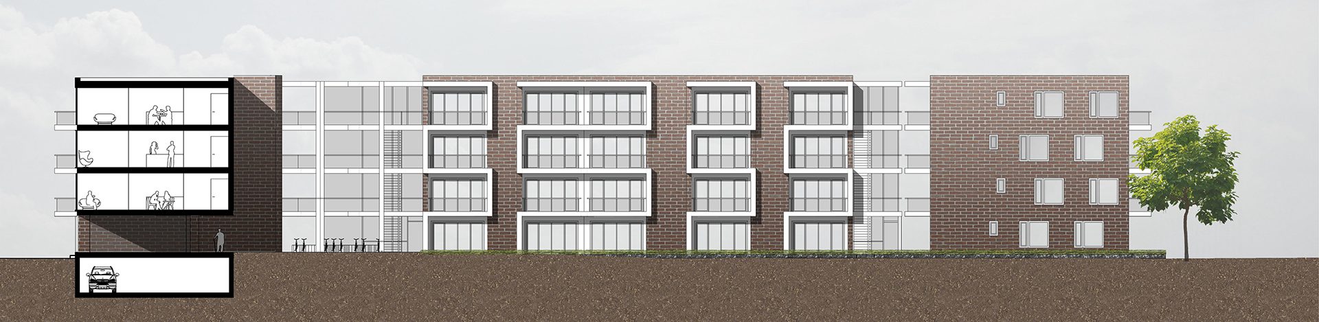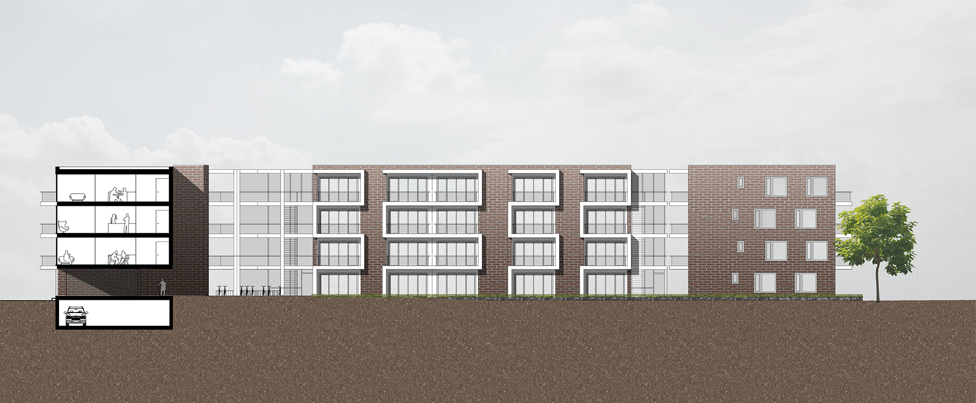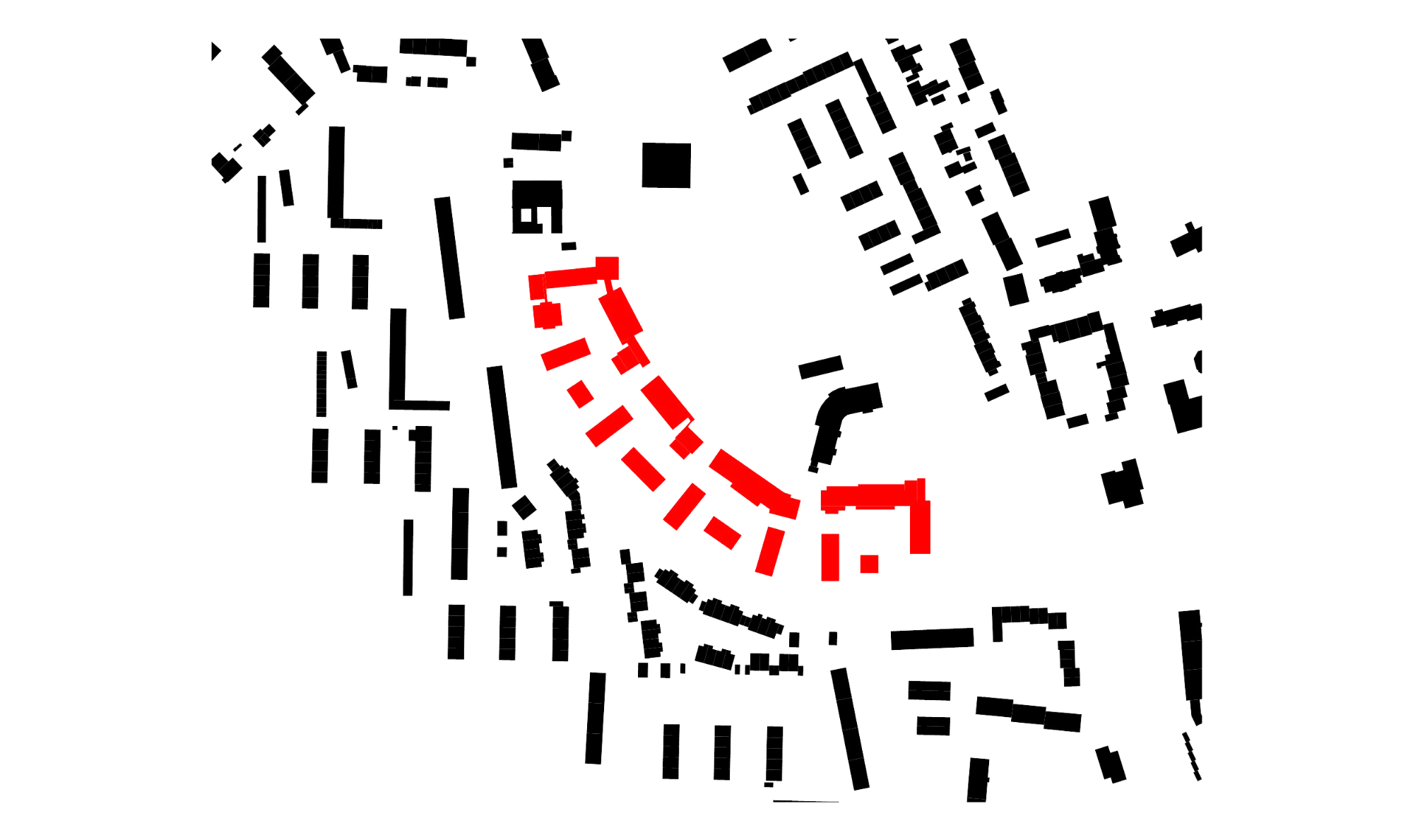 Der städtebauliche Entwurf sieht eine viergeschossige Bebauung entlang der öffentlichen Grünfläche vor und ordnet zweigeschossige Einfamilienhäuser im Innenbereich entlang der Hülchrather Straße an. Es entsteht eine klar definierte Raumkante zur Grünfläche und eineaufgelockerte, Bebauung mit einer Abfolgeunterschiedlicher Platzsituationen zwischen den Geschoß- und Einfamilienhäusern. Die Struktur der Bebauung entlangHülchrather