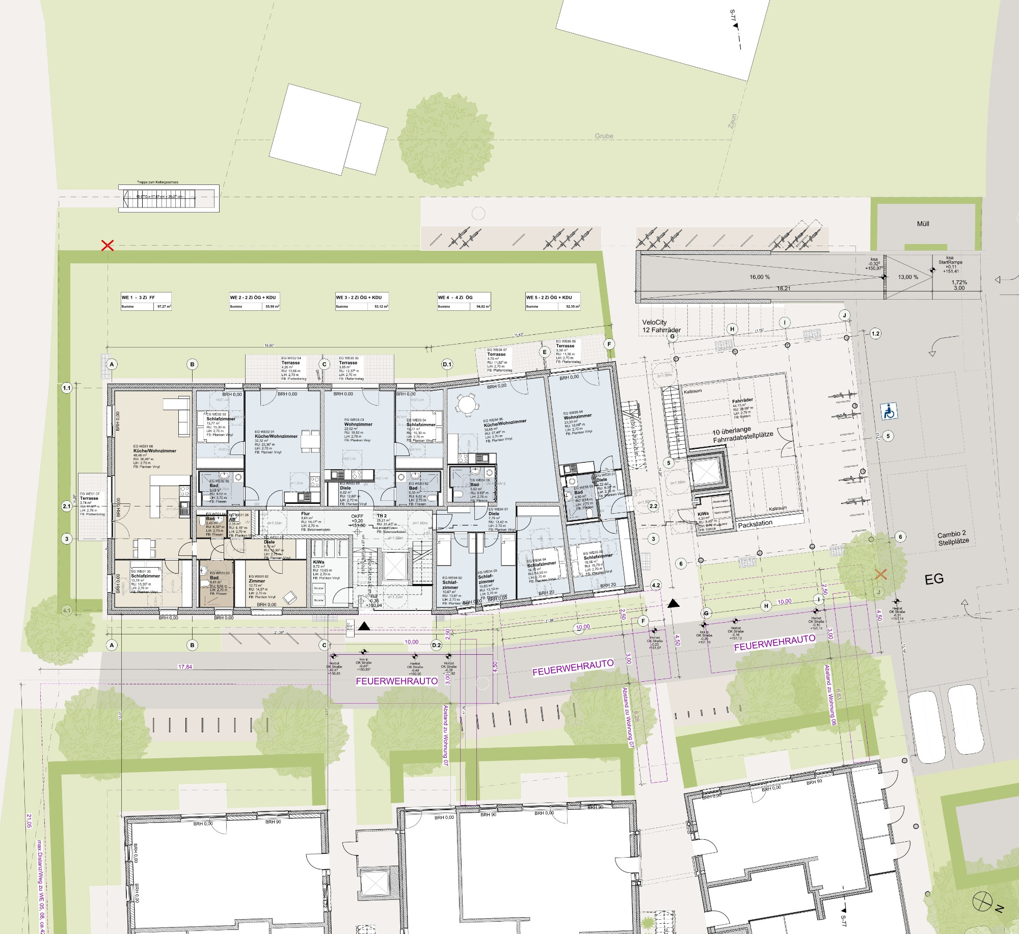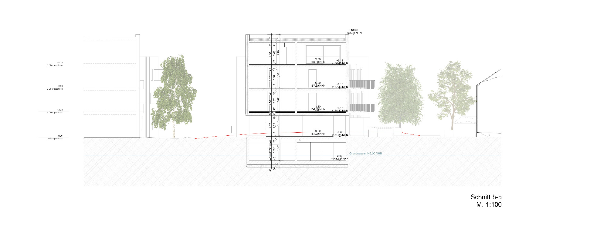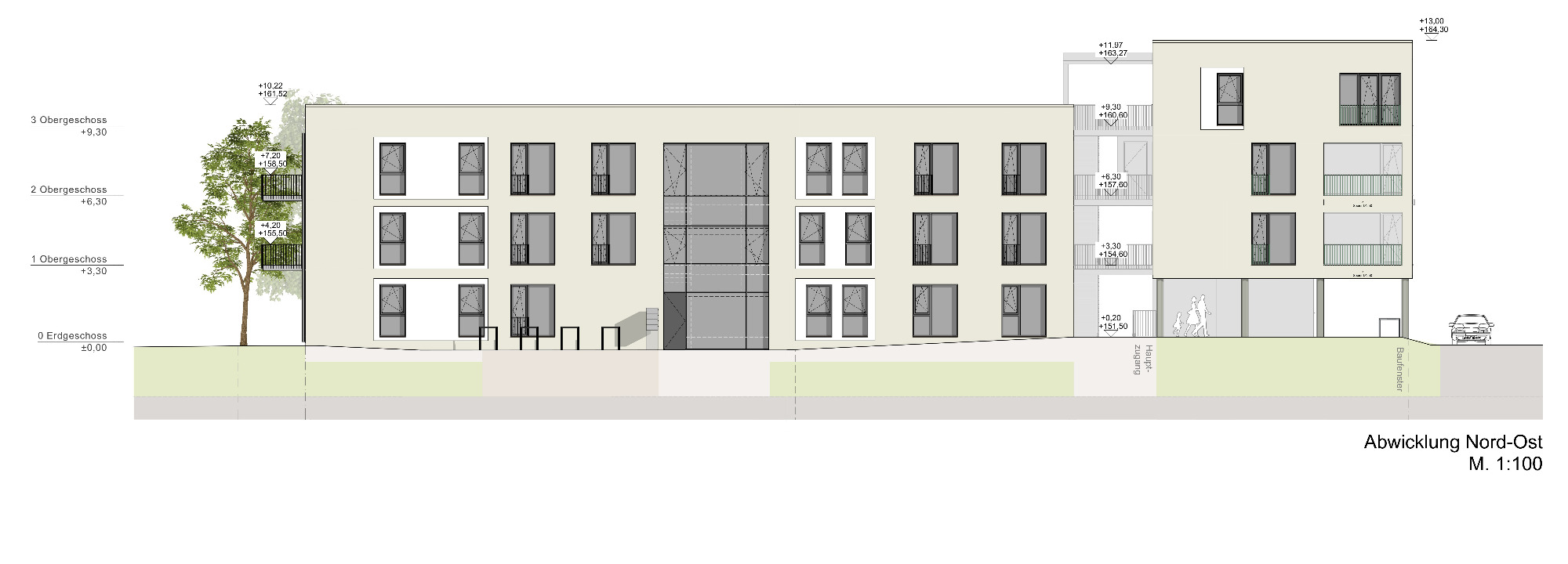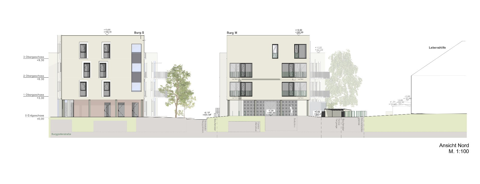 Insgesamt entstehen 20 Wohnungen, davon 16 öffentlich gefördert (zwischen 50 m² und 92 m²) und 4 frei finanziert (97 m² bis 142 m²), letztere als Penthousewohnungen mit Dachterrassen. Alle Wohnungen verfügen über einen eigenen Freisitz – Terrasse, Balkon oder Dachterrasse – und sind vollständig barrierefrei erschlossen. Zwei Gebäudeteile, ein viergeschossiger Kopfbau an der Burggrafenstraße und ein langgestreckter, dreigeschossiger Baukörper entlang des Fußwegs zur Kleingartensiedlung, umfassen die Wohnnutzung. Verbunden werden sie durch ein offenes Treppenhaus mit Aufzug, das auch Zugang zur darunterliegenden Tiefgarage bietet.