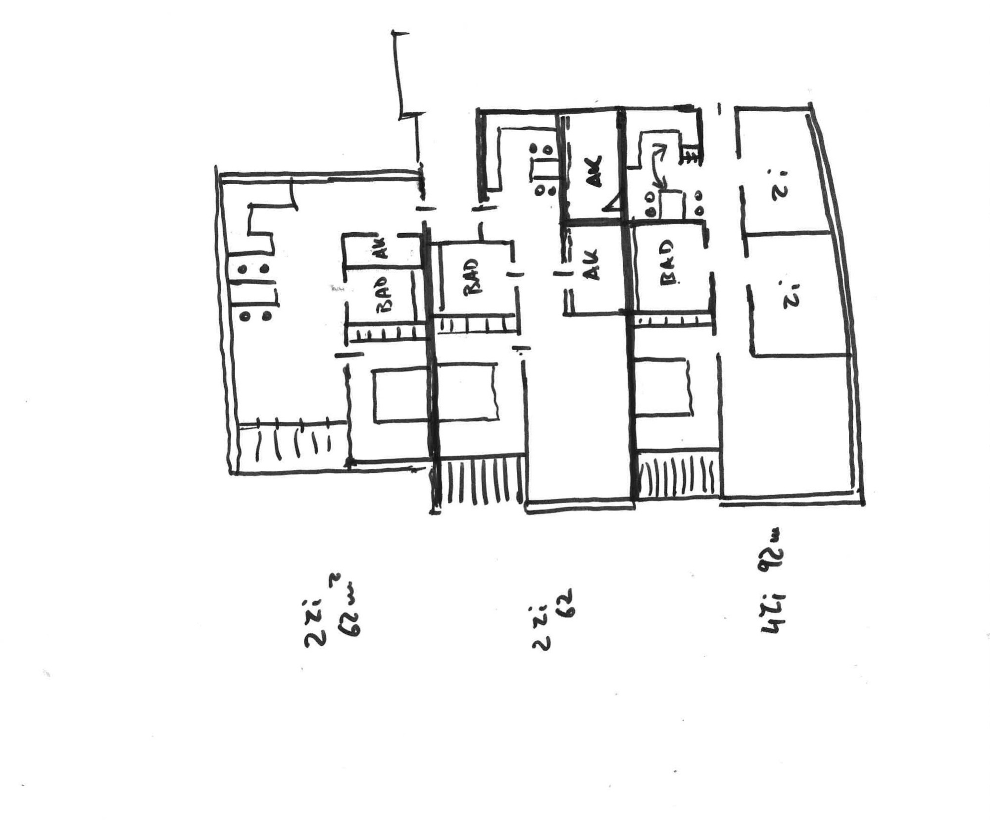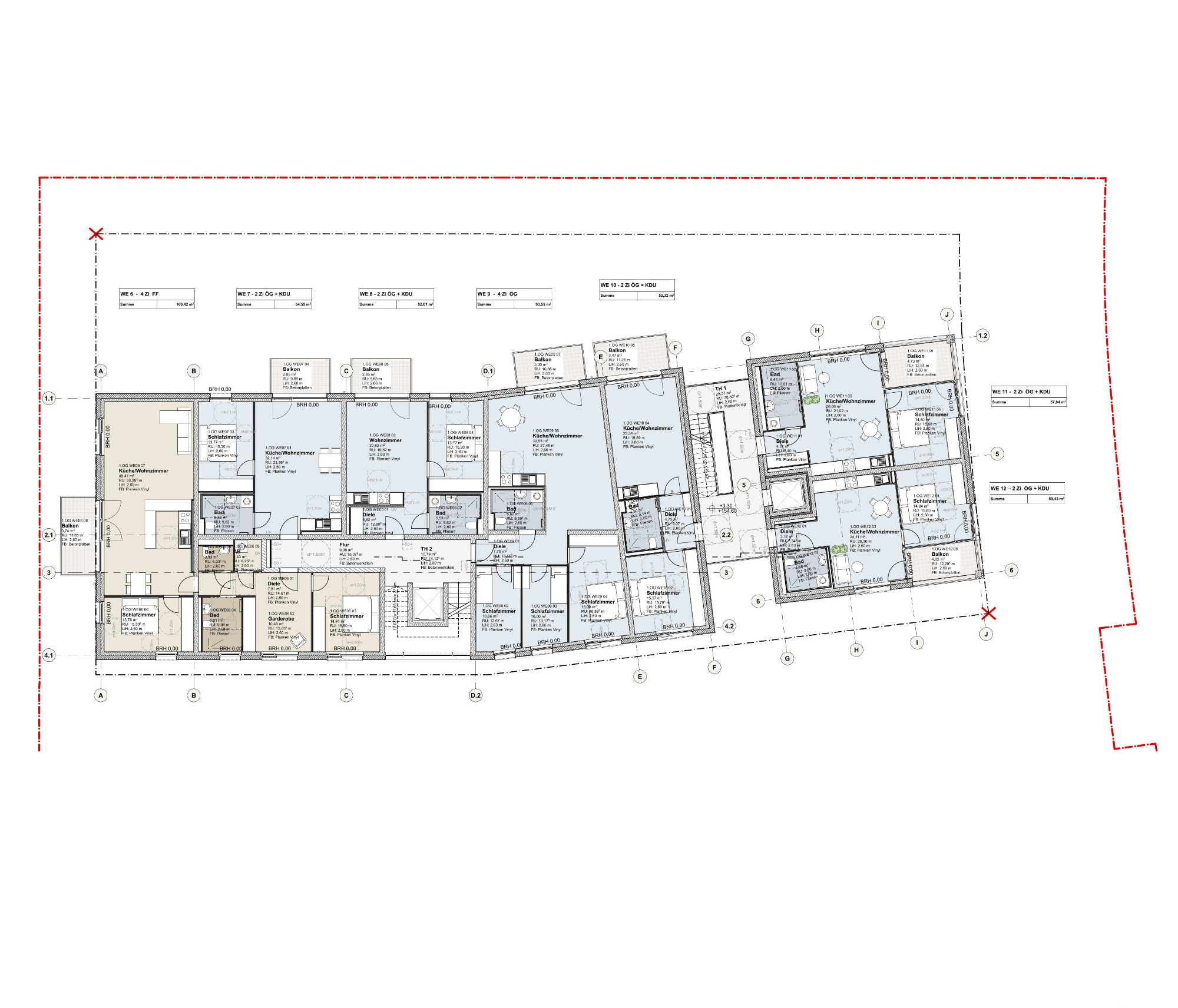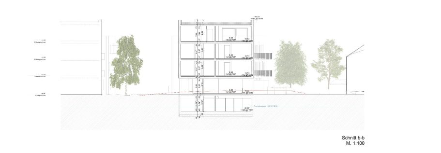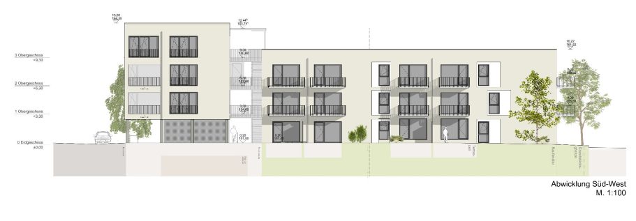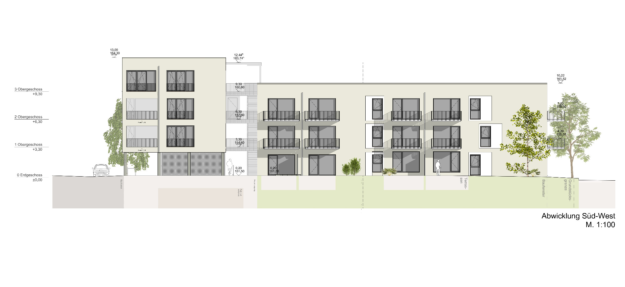 Insgesamt entstehen 20 Wohnungen, davon 16 öffentlich gefördert (zwischen 50 m² und 92 m²) und 4 frei finanziert (97 m² bis 142 m²), letztere als Penthousewohnungen mit Dachterrassen. Alle Wohnungen verfügen über einen eigenen Freisitz – Terrasse, Balkon oder Dachterrasse – und sind vollständig barrierefrei erschlossen. Zwei Gebäudeteile, ein viergeschossiger Kopfbau an der Burggrafenstraße und ein langgestreckter, dreigeschossiger Baukörper entlang des Fußwegs zur Kleingartensiedlung, umfassen die Wohnnutzung. Verbunden werden sie durch ein offenes Treppenhaus mit Aufzug, das auch Zugang zur darunterliegenden Tiefgarage bietet.