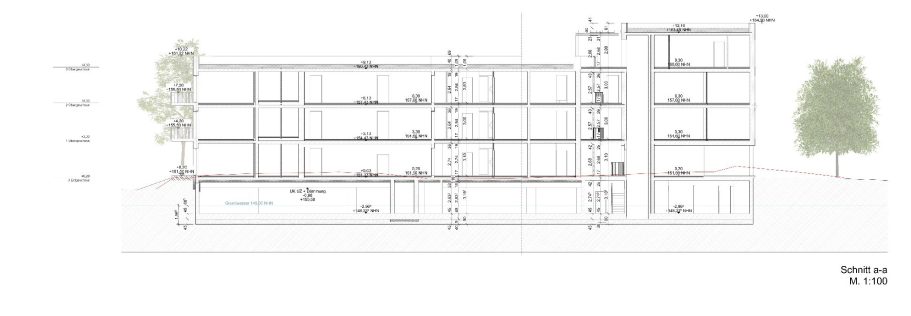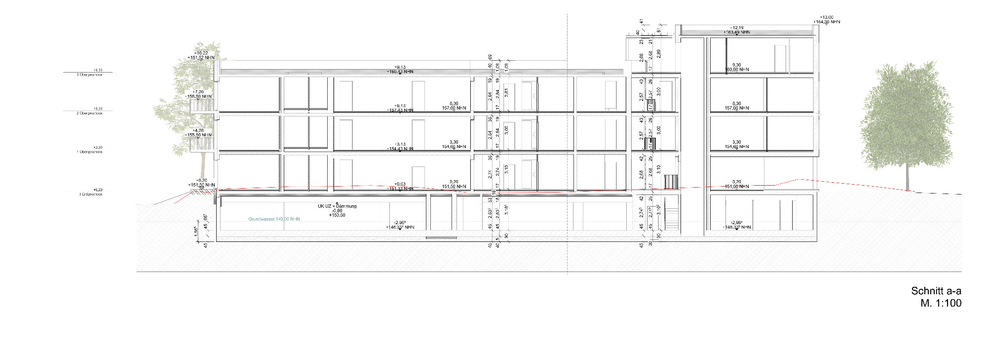 Die Gebäude werden in Massivbauweise mit Stahlbetondecken und Kalksandsteinwänden errichtet und erhalten ein Wärmedämmverbundsystem. Die Tiefgarage und Kellerräume sind als "weiße Wanne" ausgebildet und gegen Grundwasser gesichert. Die Ausstattung umfasst Aufzüge in beide Gebäudeteile, barrierefreie Zugänge, bodengleiche Duschen, Waschmaschinenanschlüsse in den Wohnungen sowie Nebenräume für Technik, Mobilitätshilfen und Abstellflächen im Untergeschoss. Müllentsorgung erfolgt außerhalb der Gebäude entlang der Grundstücksgrenze.