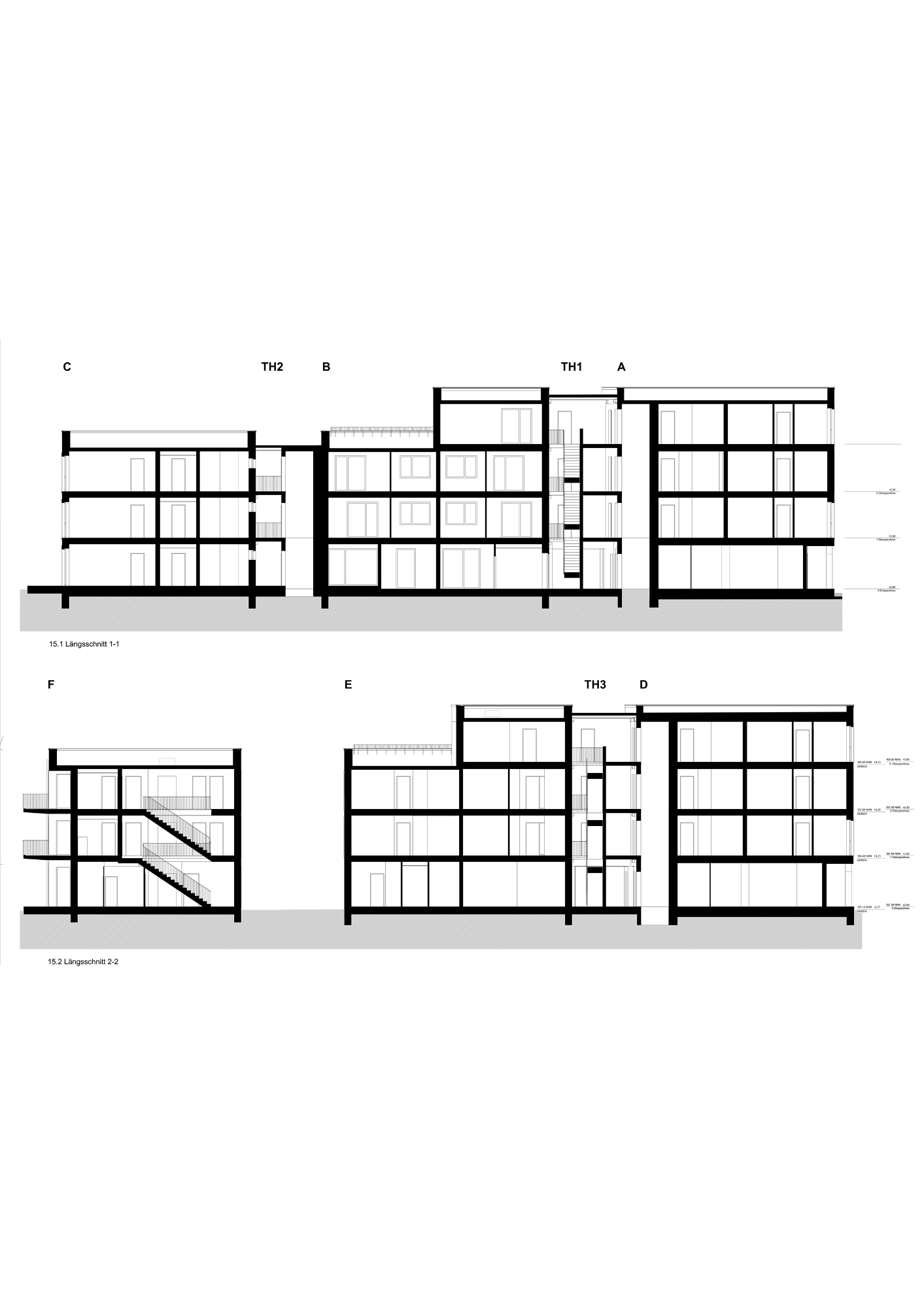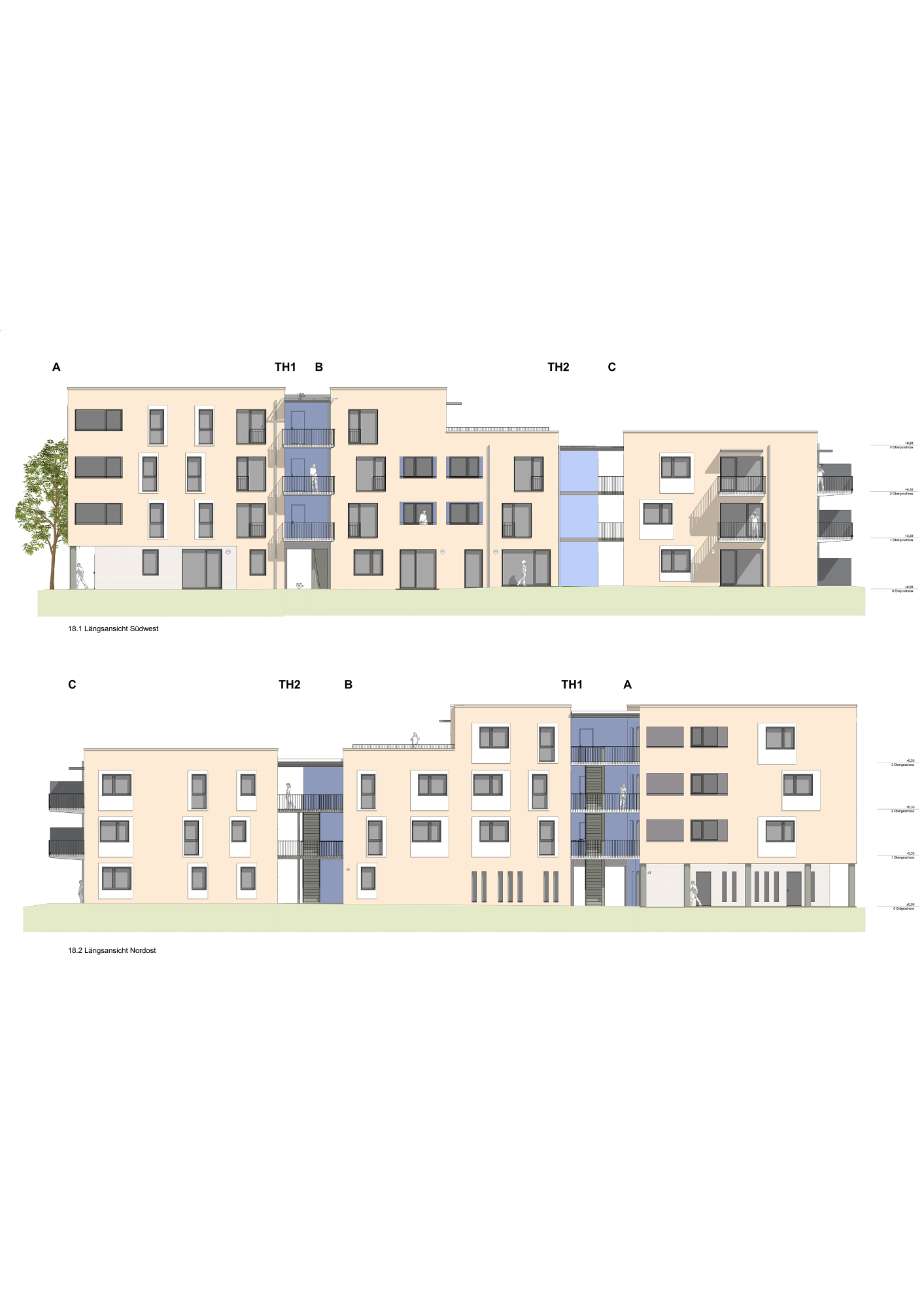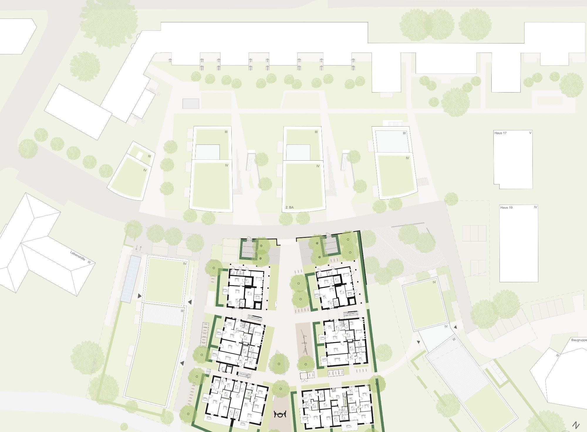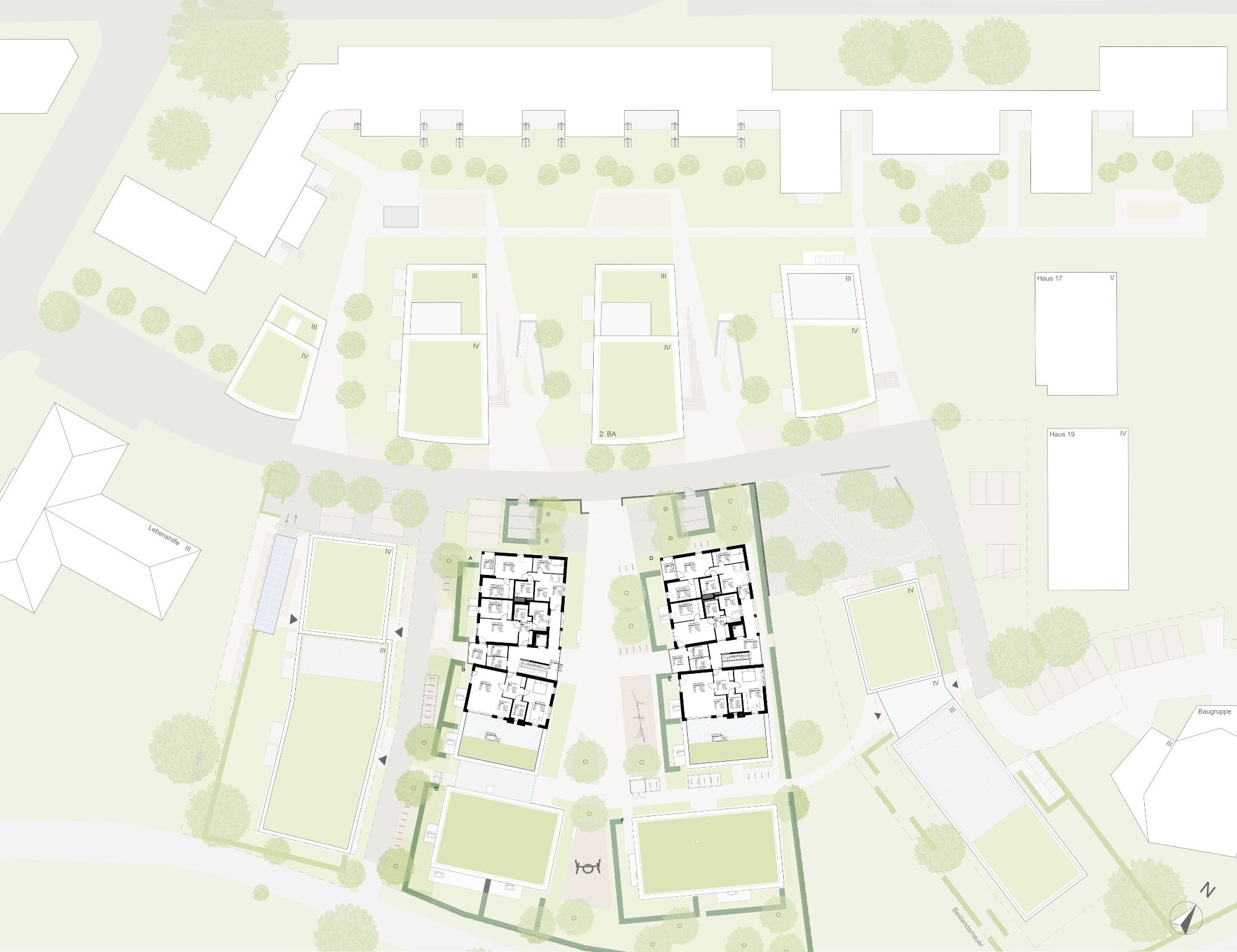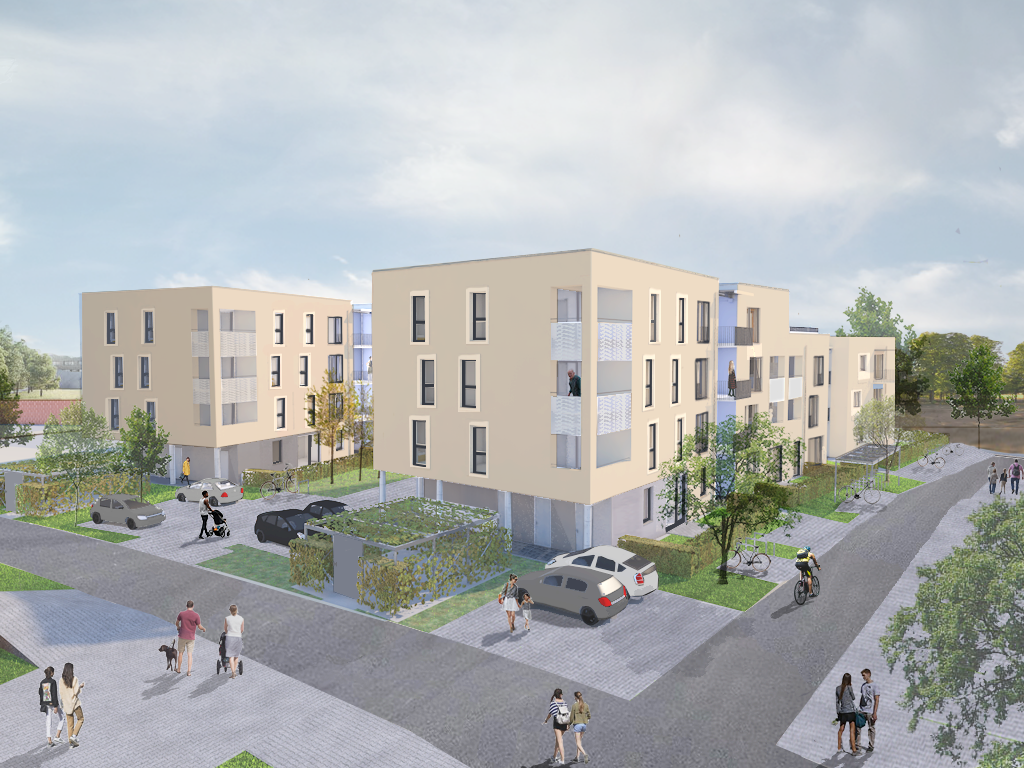 Die drei- bis viergeschossigen Gebäude A bis F werden in Massivbauweise mit Stahlbetondecken und Kalksandstein- bzw. Betonwänden mit Wärmedämmverbundsystem errichtet. Sie sind plattengründet und unterkellert. Alle Hauseingänge sind barrierefrei erreichbar, die Anforderungen der DIN 18040 zur Barrierefreiheit werden durchgängig erfüllt. Zwei Erdgeschosswohnungen sind als rollstuhlgerechte öffentlich geförderte Wohnungen konzipiert. Jedes Gebäude verfügt über einen Aufzug – teils in überdachten Außentreppenhäusern (Gebäude A–E), teils innerhalb der Gebäudestruktur (Gebäude F).