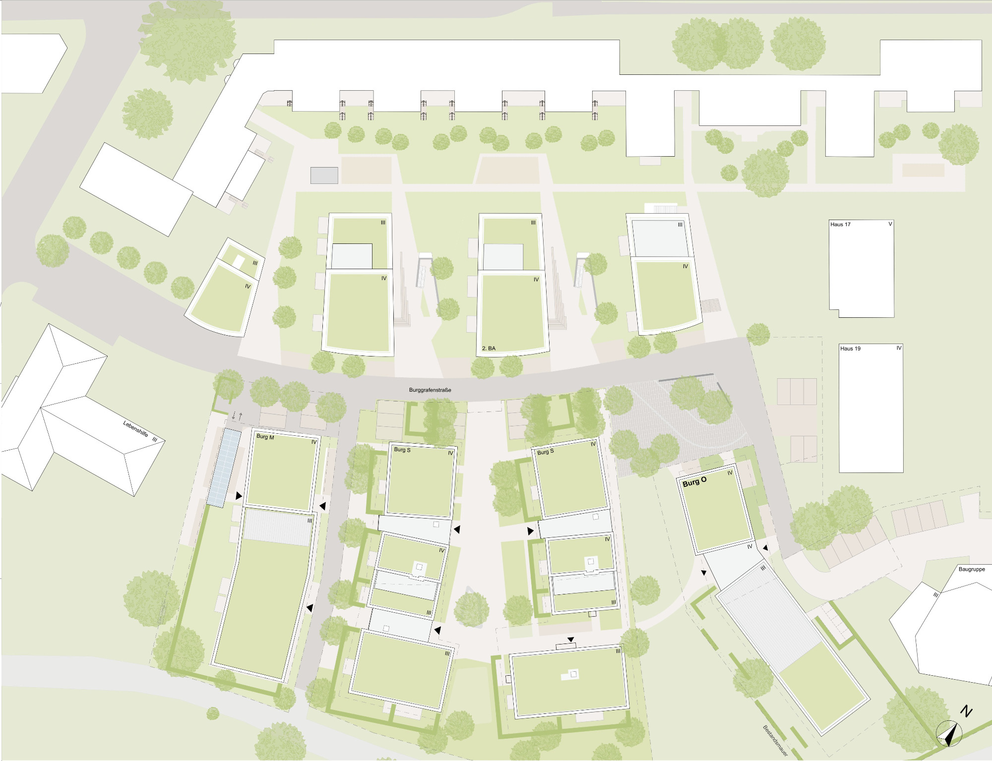 Das Büro 3Plus Freiraumplaner hat die Freiraumgestaltung für das gesamte Quartier sowie für „Burg S“ übernommen. Ziel ist eine ruhige, grün geprägte Außenraumgestaltung mit klarer Trennung zwischen privaten Gartenbereichen und dem halböffentlichen, autofreien Innenhof. Die Verbindung zum benachbarten Wurmtal wird gestärkt. Zentral auf dem Gelände befindet sich ein Kinderspielplatz.