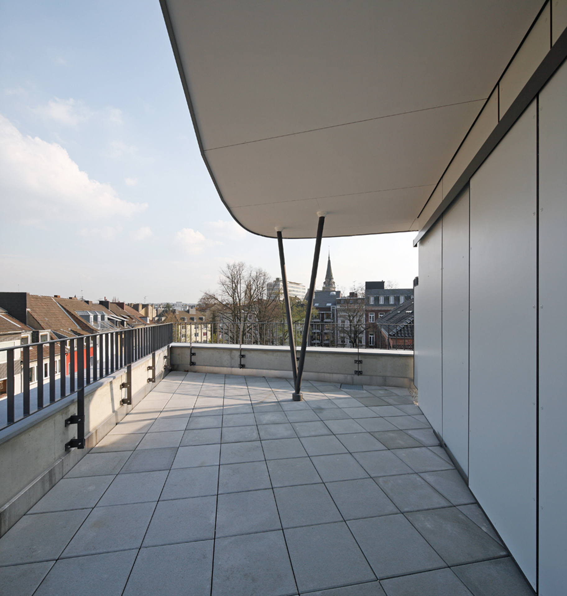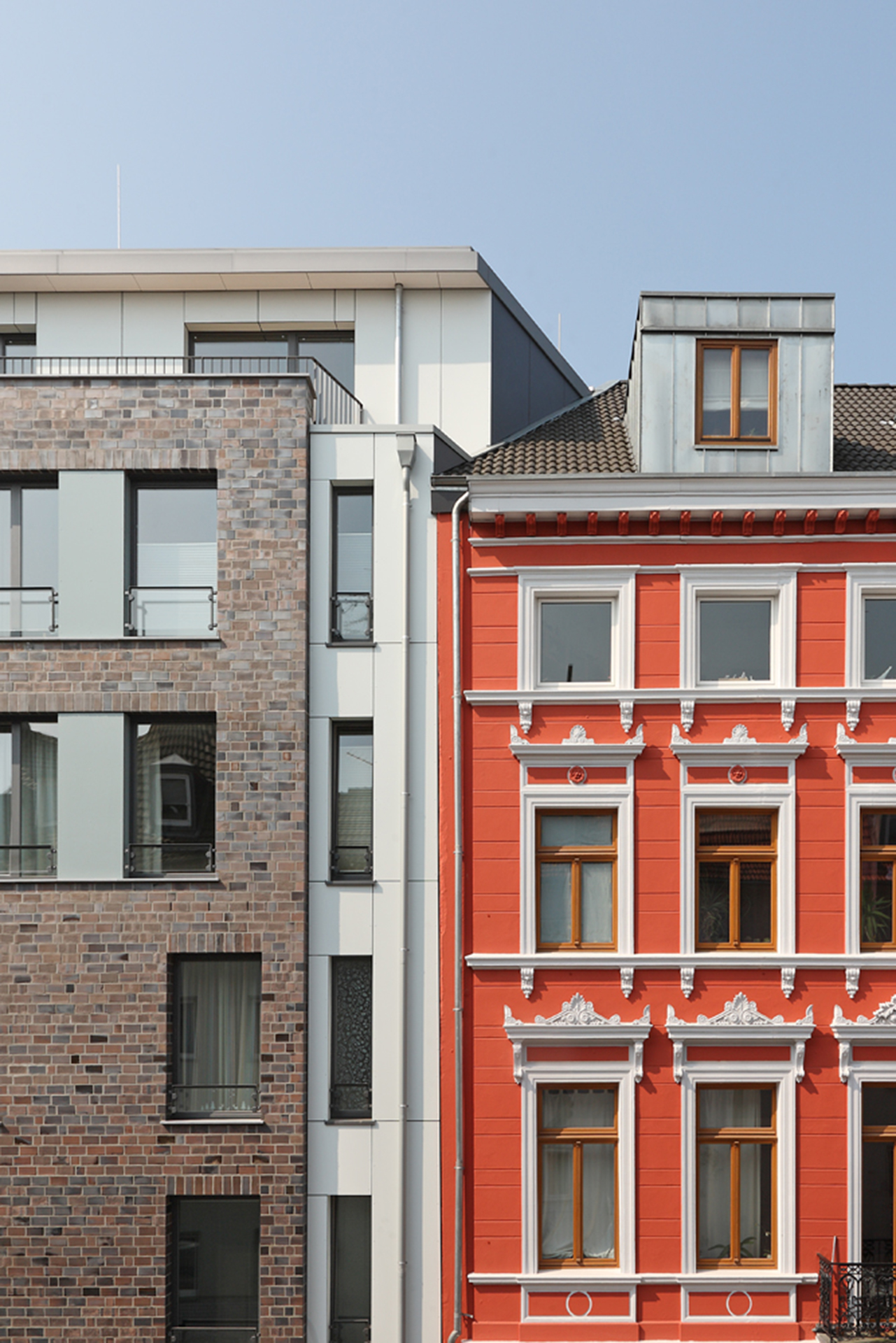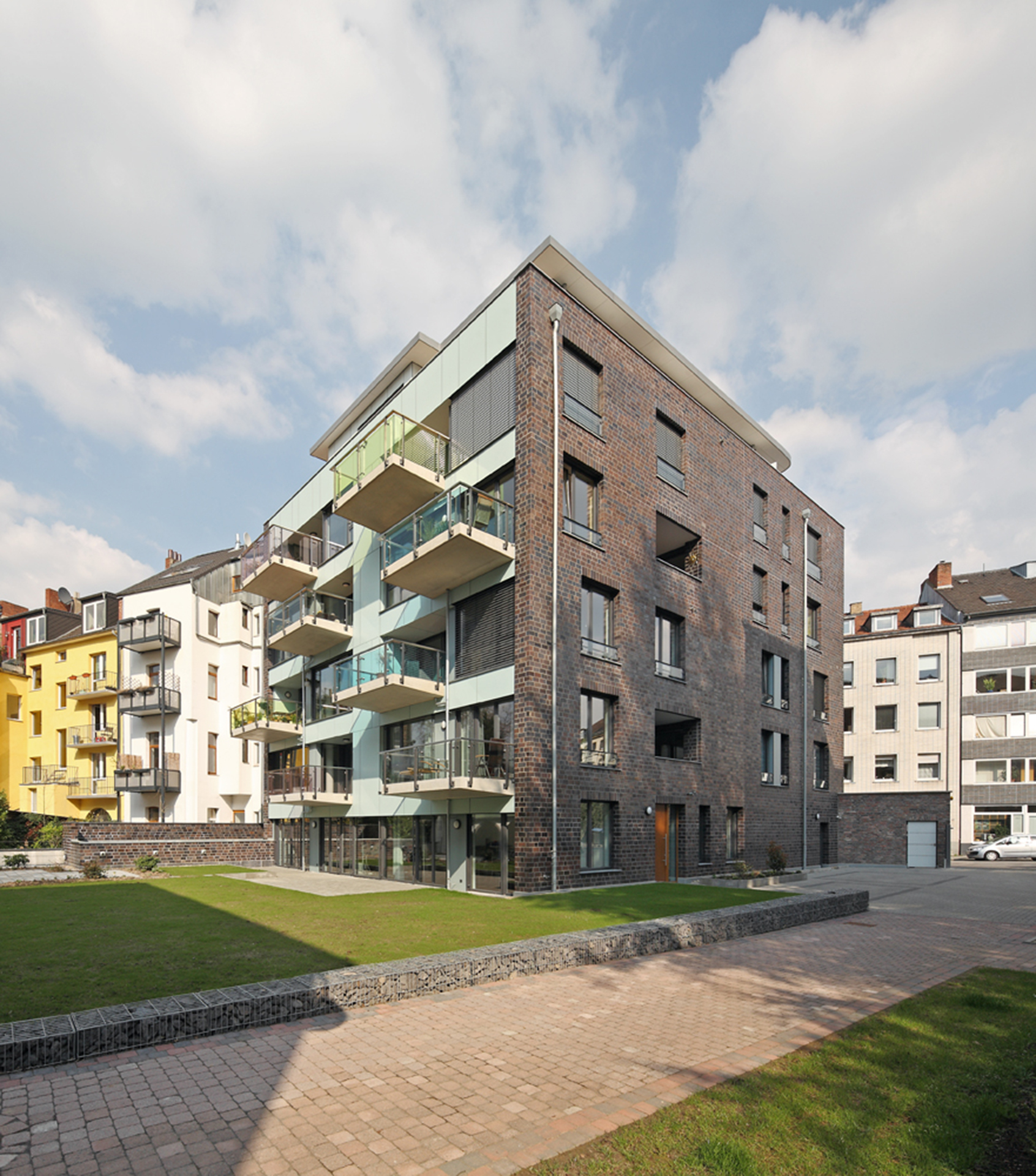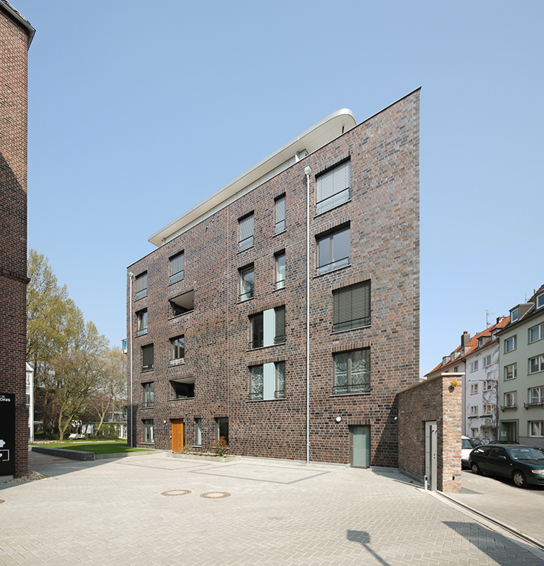 Das unbebaute Grundstück des ehemaligen Klosters St. Alfons grenzt an eine seit fast 140 Jahren kahlen Brandgiebel. Der fünfgeschossige Neubau schließt diese offene Wunde in der Stadt und bildet einen Abschluß des Blockrandes. Zusammen mit dem ehemaligen Kloster St Alfons bildet es ein Emsemble und betont die städtebaulich besondere Situation der bewusst unbebauten Ecke.