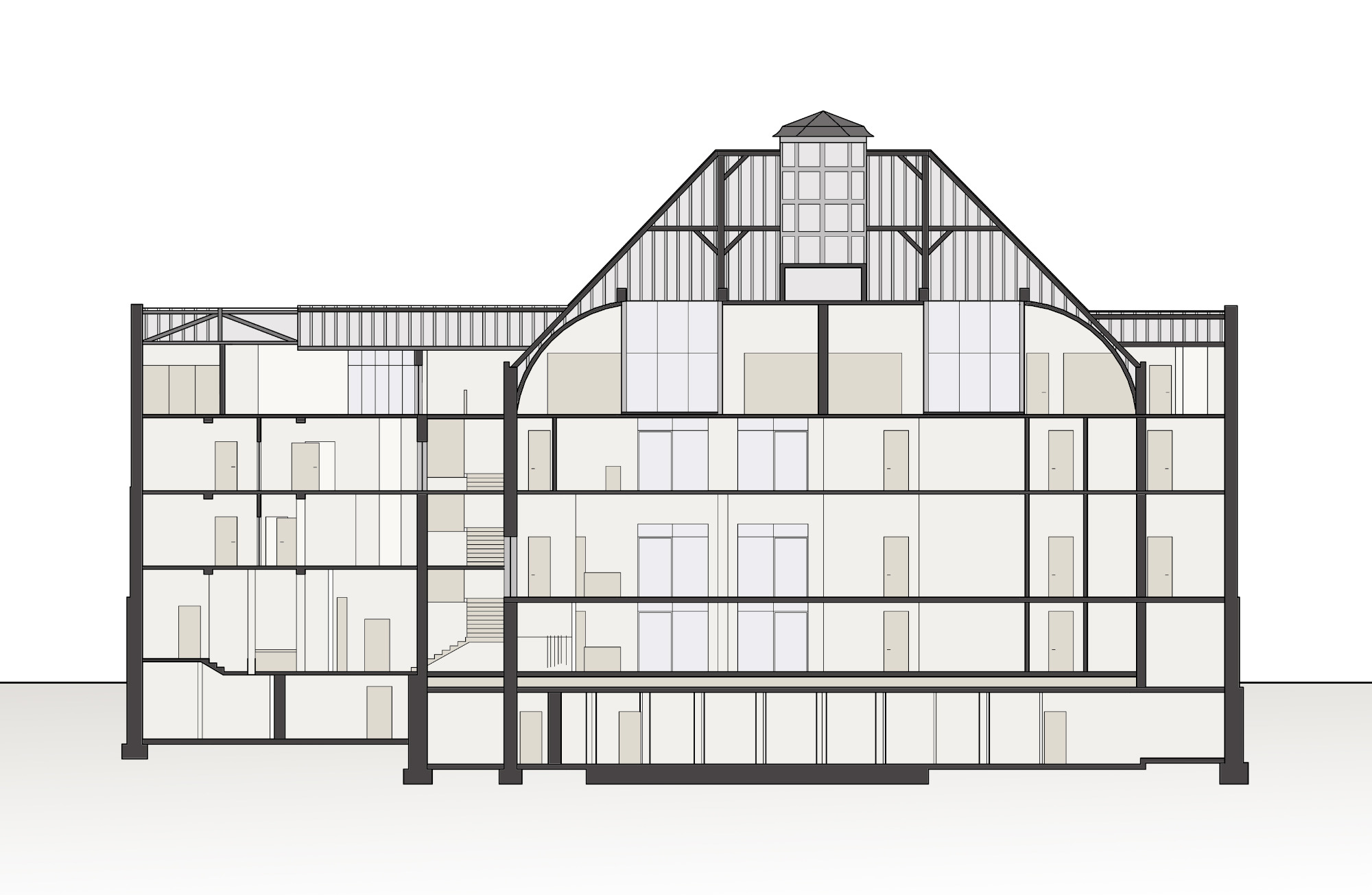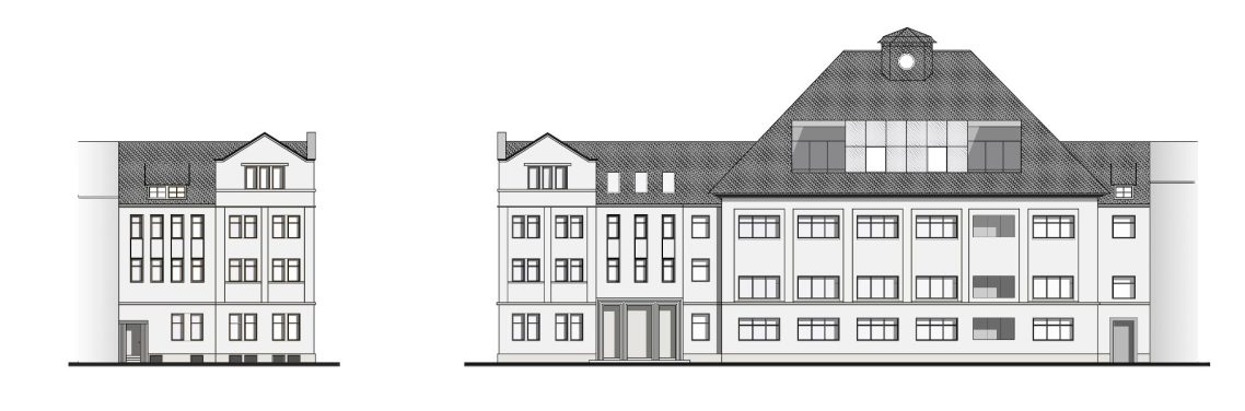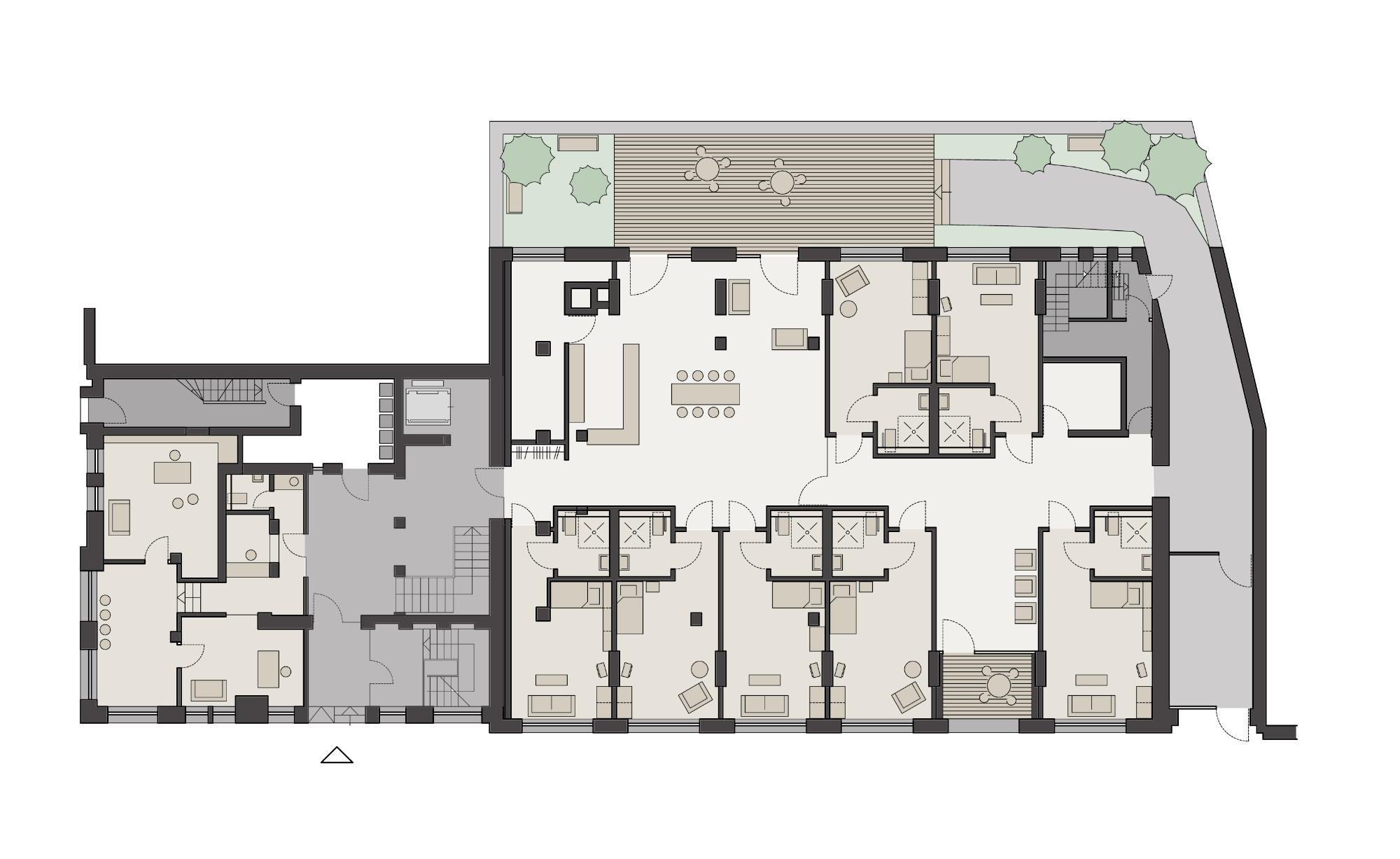 Das Entwurfskonzept sieht für das Erdgeschoß, das 1. und 2.Obergeschoß im Bereich der ehemaligen heute als Hotelzimmer genutzten Schwimmhalle insgesamt drei ambulant betreute Gruppenwohnungen vor. Die Etagen werden ebenerdig bzw. über einen neu einzubauenden Aufzug erschlossen. Unmittelbar an den Eingangsbereich mit Garderobe grenzt der Wohngruppenraum mit offener Küche. Hier werden Mahlzeiten zubereitet, gegessen und die gemeinsame Freizeit gestaltet. Dem Wohngruppenraum ist eine großzügige Terrasse vorgelagert. Eine separate Sitznische bietet die Möglichkeit sich etwas abseits zu treffen. Sie sorgt für eine natürliche Belichtung des Flurs. Jede Gruppenwohnung verfügt über Individualräume für 7-8 Bewohner mit angegliedertem barrierefreiem Bad. Die Bewohner leben so in einer Gemeinschaft, die Ihnen ermöglicht, am Leben in der Wohngruppe teilzunehmen aber auch individuell Ihren privaten Wohnraum zu nutzen. Ein der Küche zugeordnetes Lager und ein Hauswirtschaftsraum ergänzen das Raumprogramm in jeder Wohnung. Als zusätzliche Einrichtung sieht die Planung im Untergeschoß ein komfortables Pflegebad vor. Den Gruppenwohnungen stehen insgesamt 22 Abstellräume im Untergeschoß zur Verfügung.