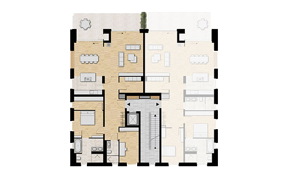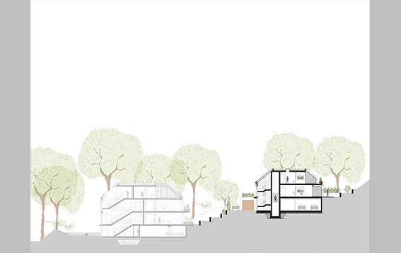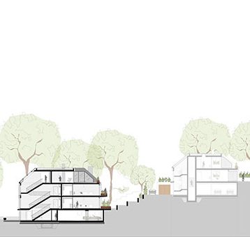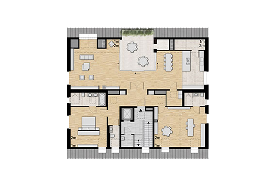 Vom Vorplatz betritt man die Wohnhäuser durch einen hellen und geräumigen Eingangsbereich. Hier befindet sich auch der ebenerdige Zugang zur Parkgarage mit sieben Stellplätzen. Mit dem Aufzug erreicht man schwellenlos die Wohnetagen. Alle Wohnungen verfügen über großzügige Wohn- Essbereich Bad und Gästebad, sowie großzügige Terrassen, Balkone oder Loggien.